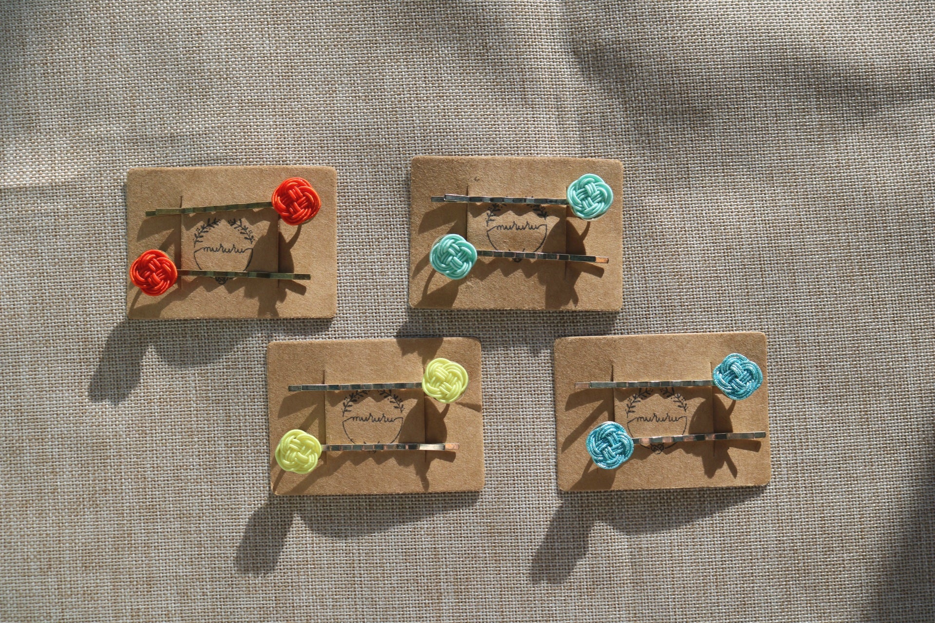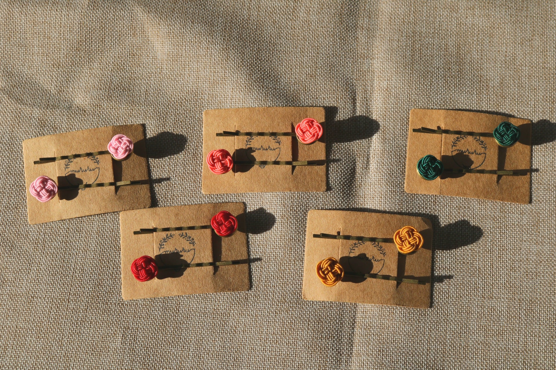 D. Handmade hairpins made with Japanese traditional knotting style Nanohanamusubi with Japanese traditional Mizuhiki strings.
