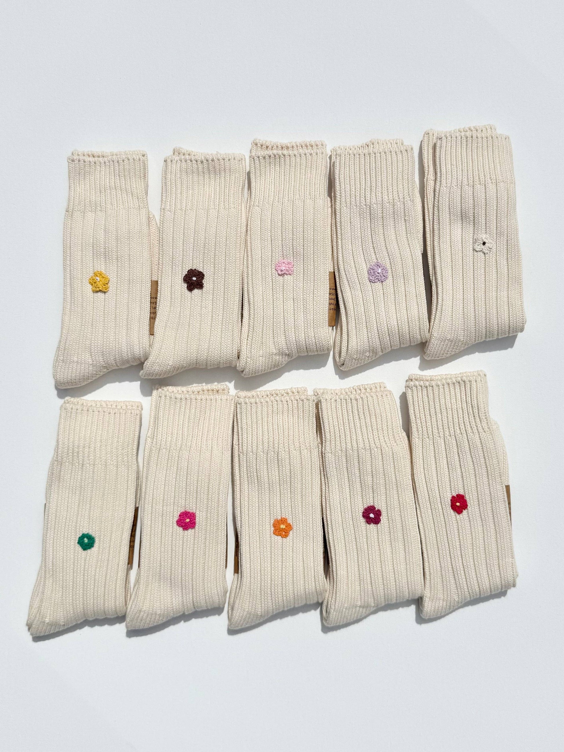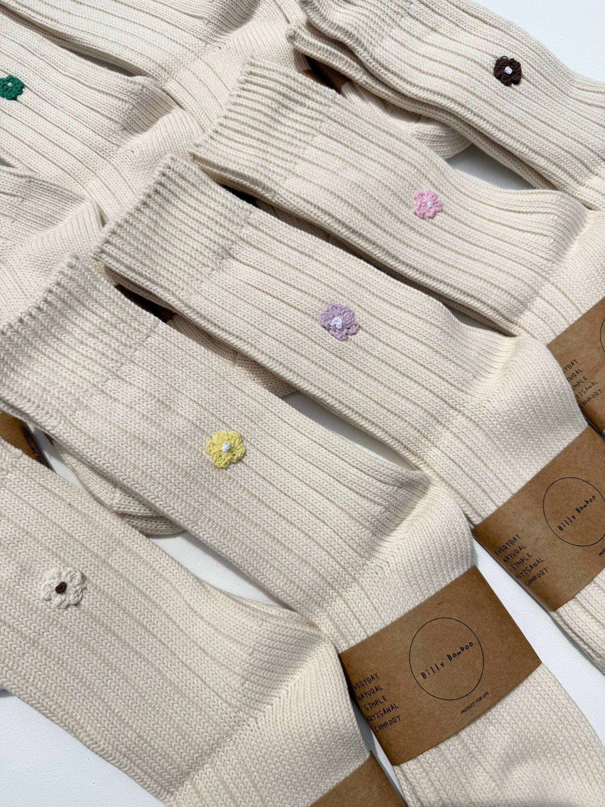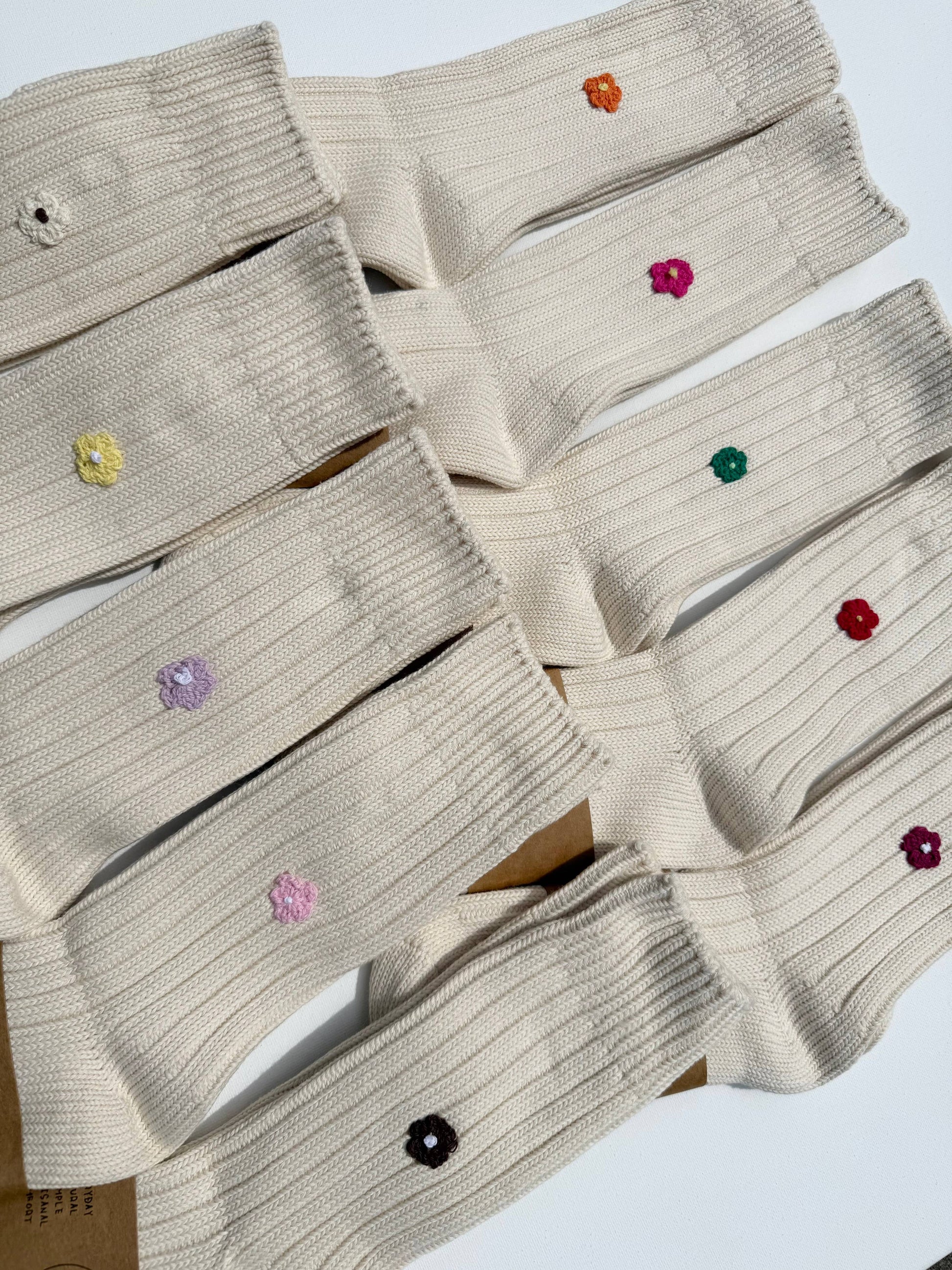Step into cozy luxury with the Chunky Ribbed Cotton Socks designed for unbeatable comfort and durability. Made from heavy-duty, undyed cotton, these socks offer a soft yet sturdy fit, perfect for everyday wear. Each pair features delicate handmade crochet flowers in multiple vibrant colors, adding a charming, artisanal touch to your outfit. The longer cuff ensures a snug fit that stays in place, whether you're lounging at home or out for a casual stroll.