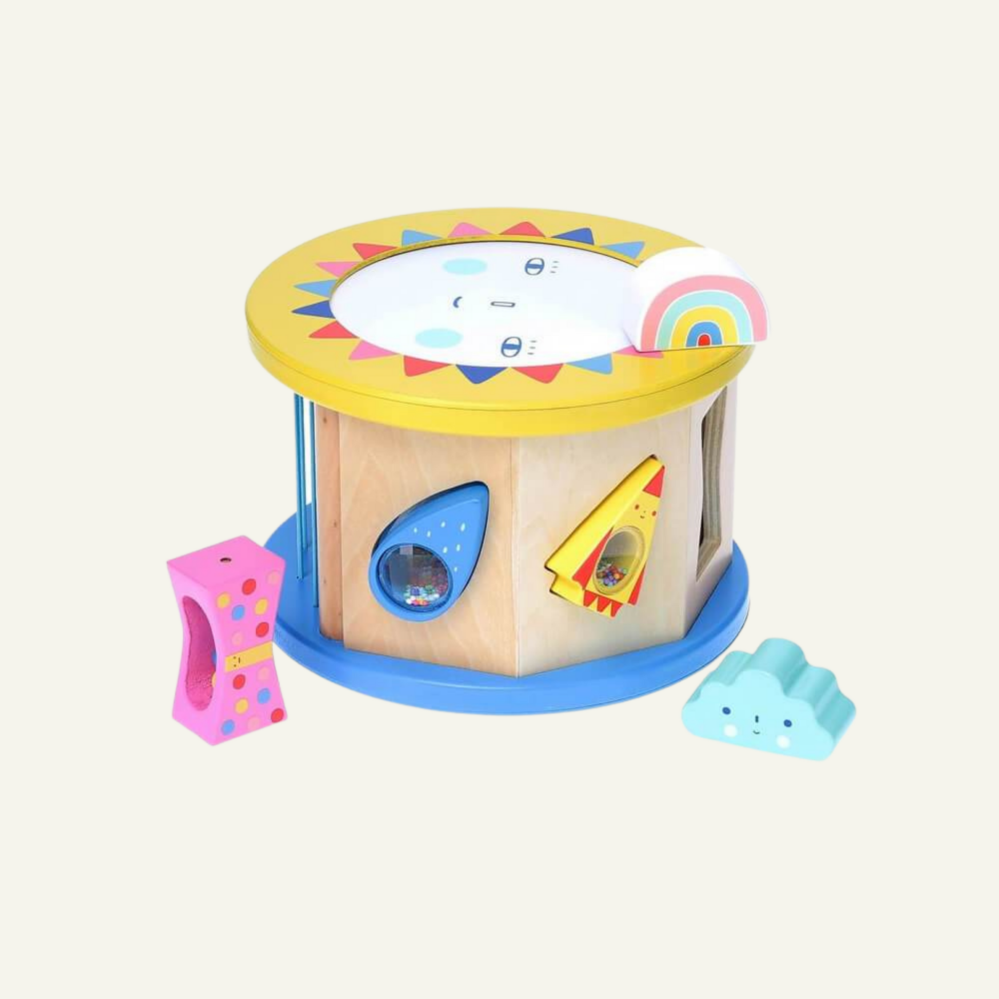 Craquez pour cette boite à formes toute ronde et pleine de douceur qui favorisera l'éveil des petits. Un côté jour, un côté nuit, un soleil tambour ! Et surprise… Les formes à encastrer font des petits bruits rigolos. La plus craquante est certainement la gouttelette, dotée d'un kaléidoscope trop chouette !