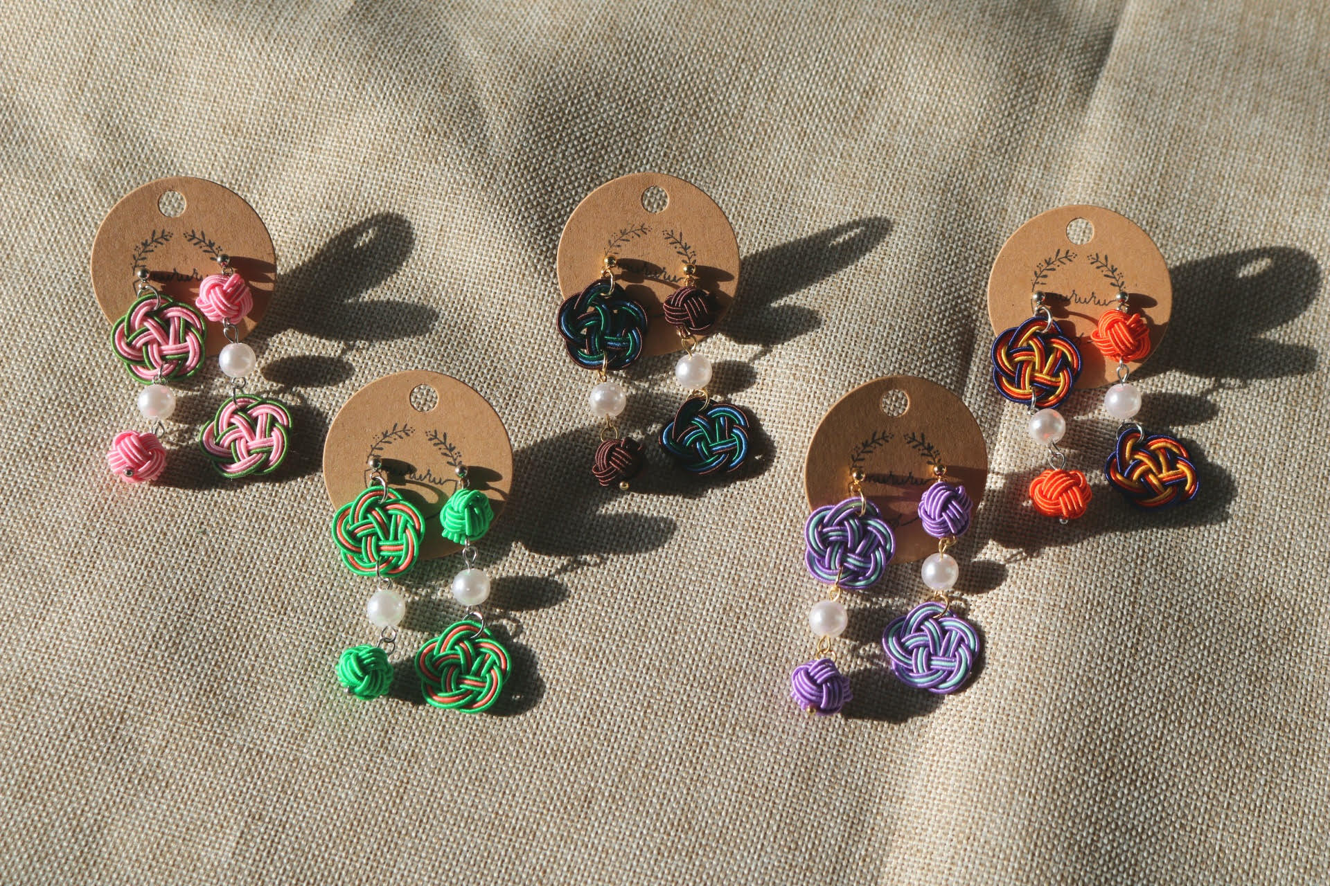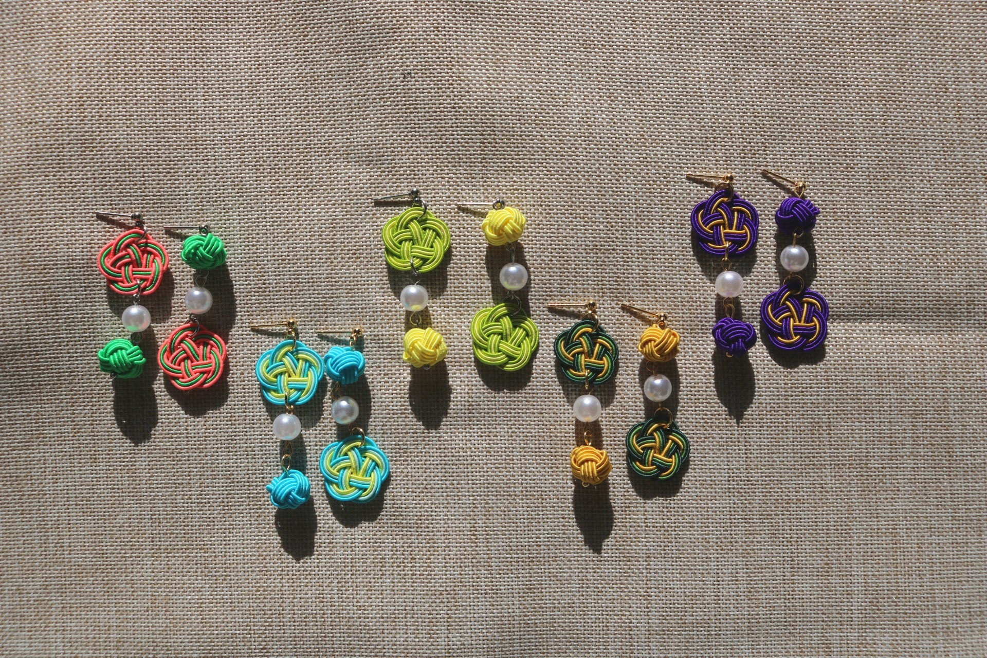 Boucles d'oreilles faites à la main à Montréal, fabriquées à partir d'une combinaison de nœuds traditionnels japonais Umemusubi et Tamammusubi avec des cordes traditionnelles japonaises Mizuhiki.
