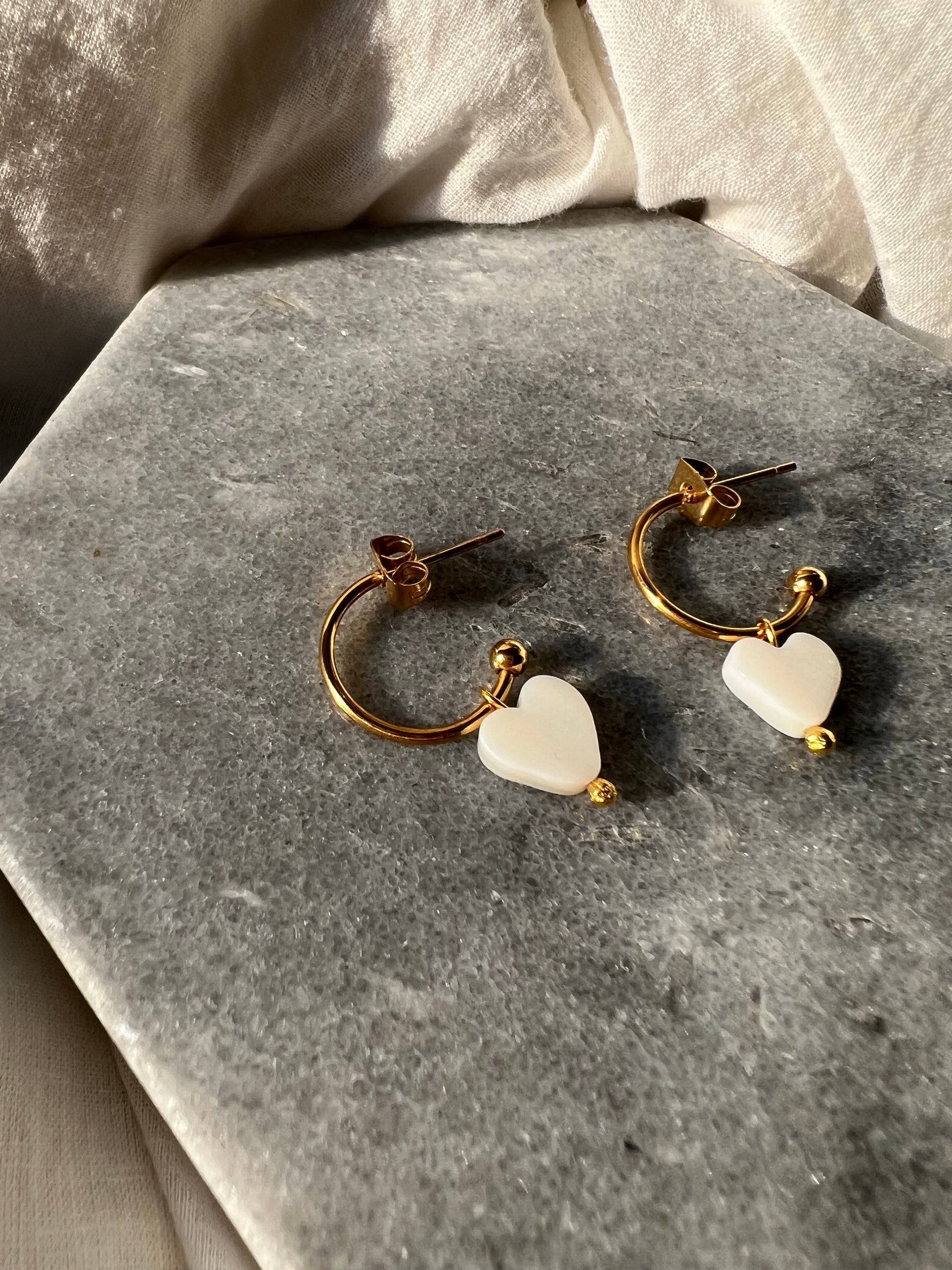 A beautiful pair of loops with pearly heart, all suspended from semi-open (15mm) stainless steel creole.