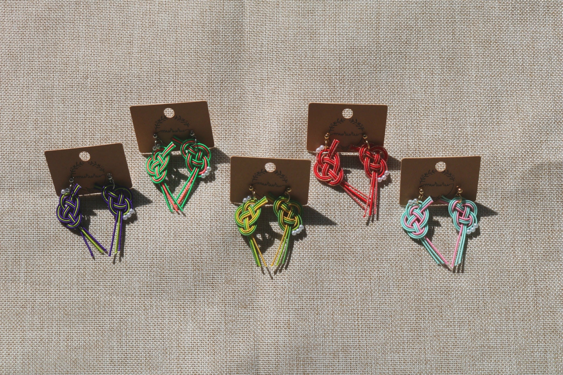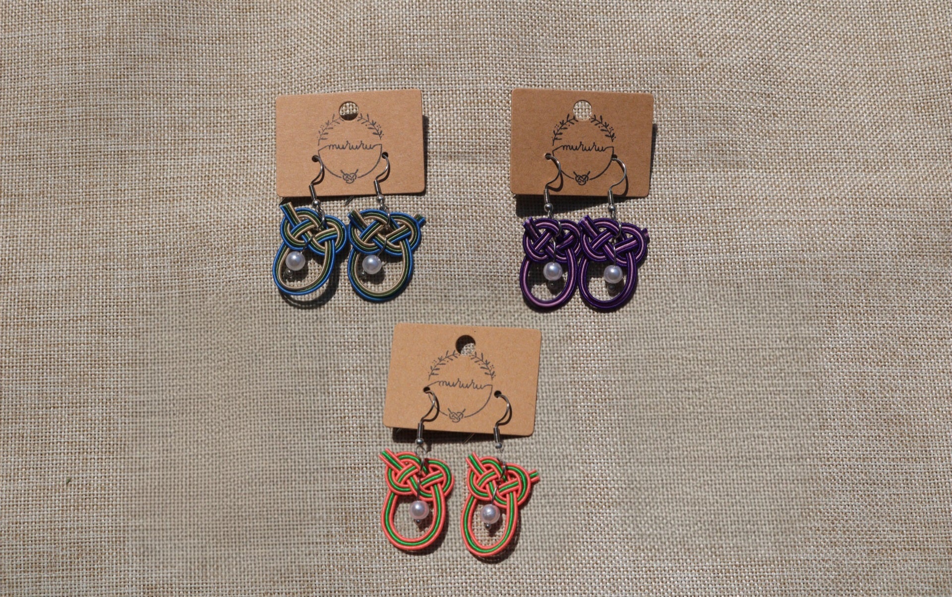 F. Handmade earrings made with Japanese traditional knotting style Awajimusubi with Japanese traditional Mizuhiki strings.