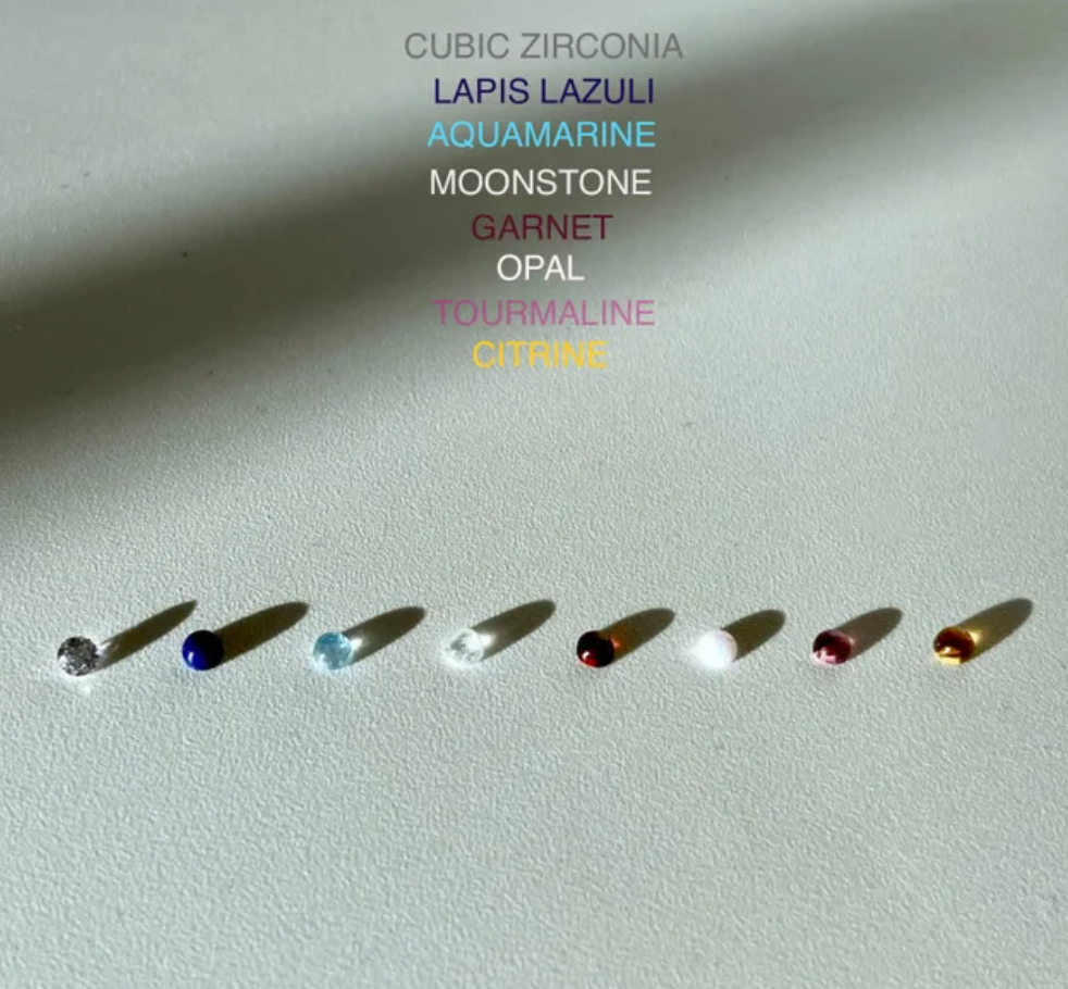 3mm round stones claw set in sterling silver. Available with moonstones, aquamarine, garnet, citrine, peridot, opal, cubic zirconia and tourmaline stones.