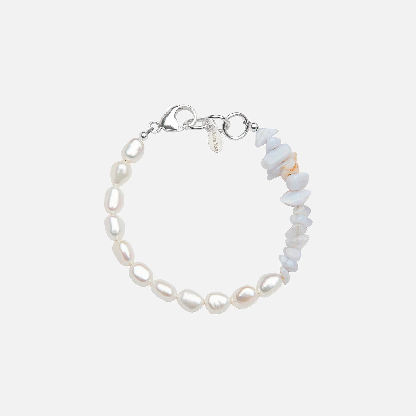 Tumbled gemstone chips are the basis for our reimagination of the puka shell bracelets and necklaces popular in our youth, and we've tried to elevate them a bit by matching them with these really lovely baroque rice pearls.