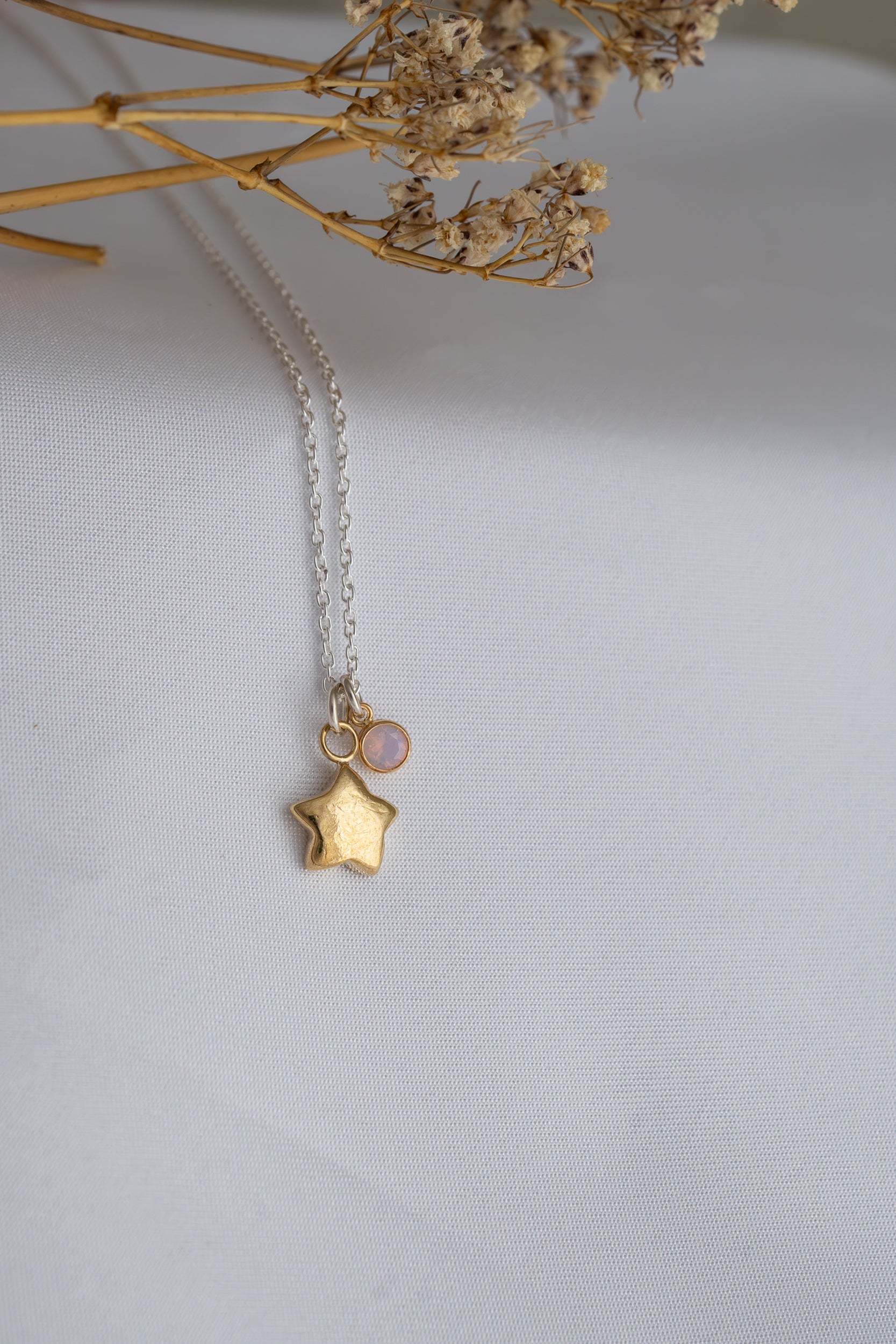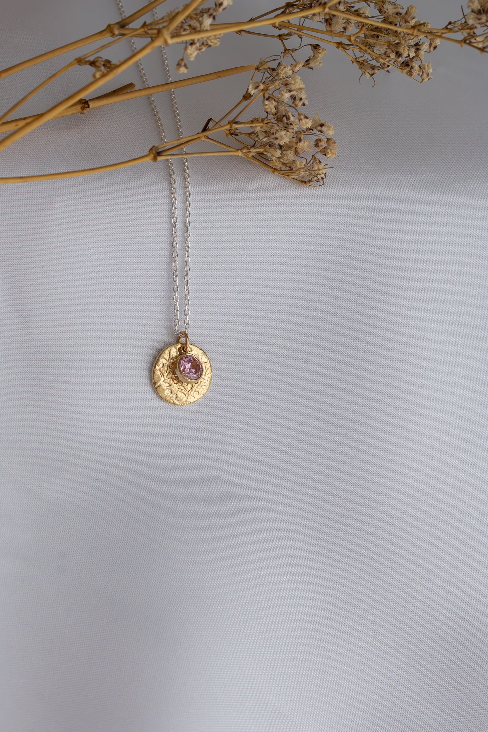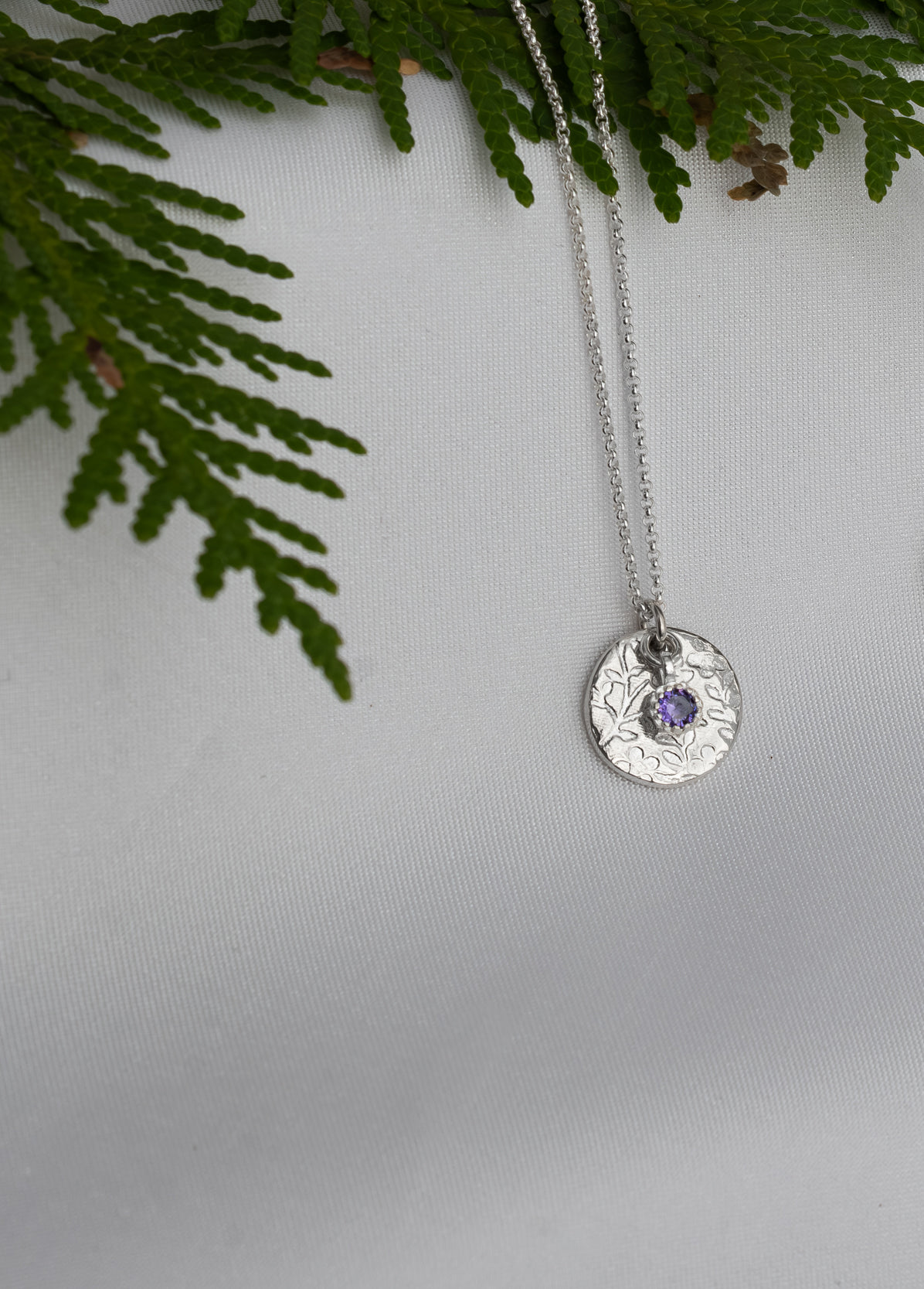 M044 Collier médaillon fleuri argent pierre mauve - $62.00