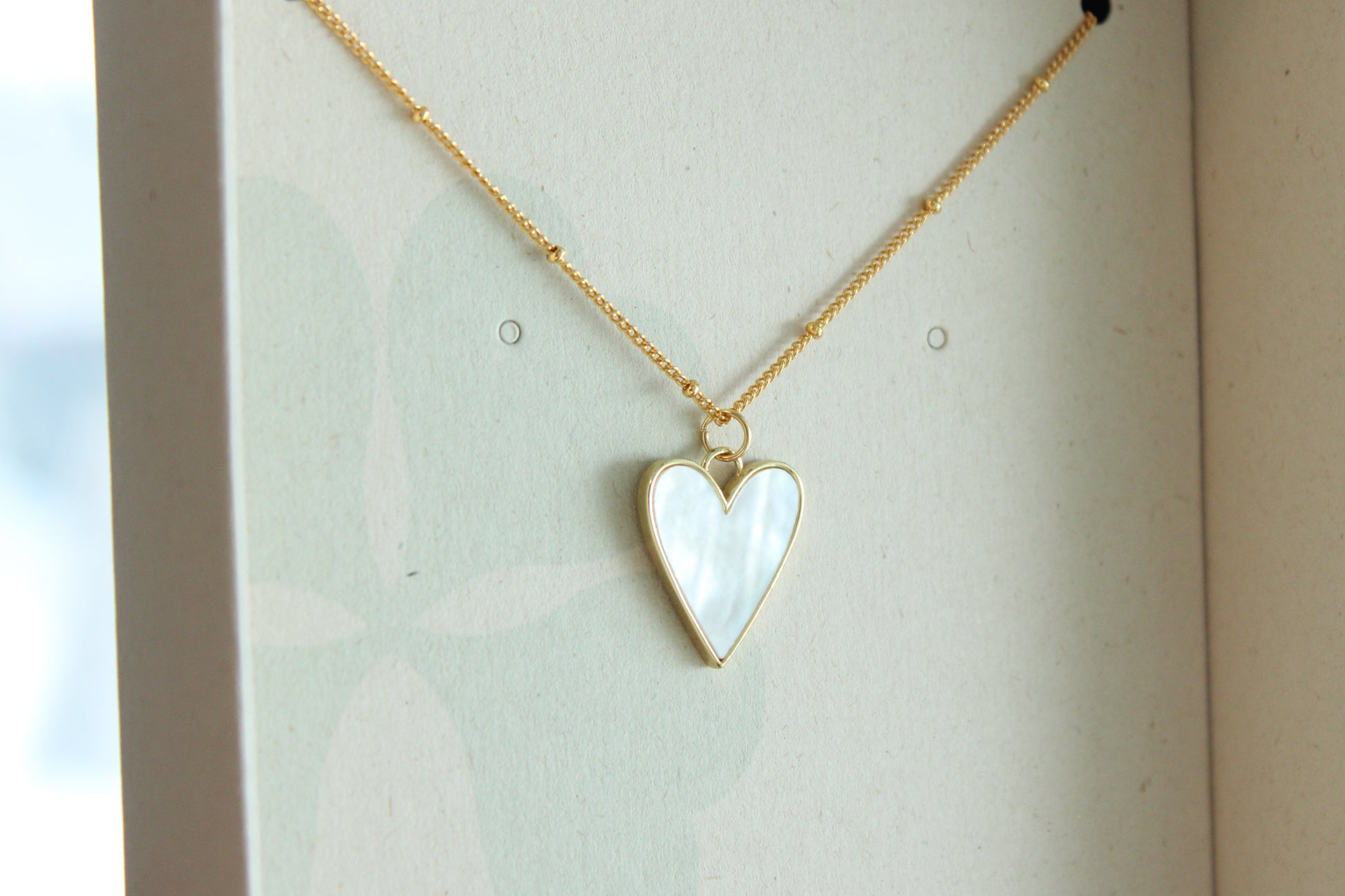 Chaîne à billes et petites billes plaqué or 24Kt avec un cœur en nacre
