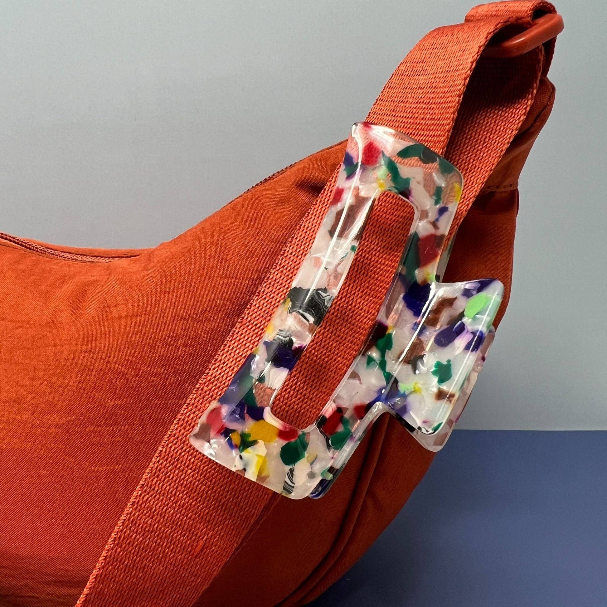 Made from durable acrylic and packed with playful flecks of vibrant color, this hair claw is designed to turn heads. The translucent body features an explosion of multicolor confetti—reds, purples, yellows, greens.
