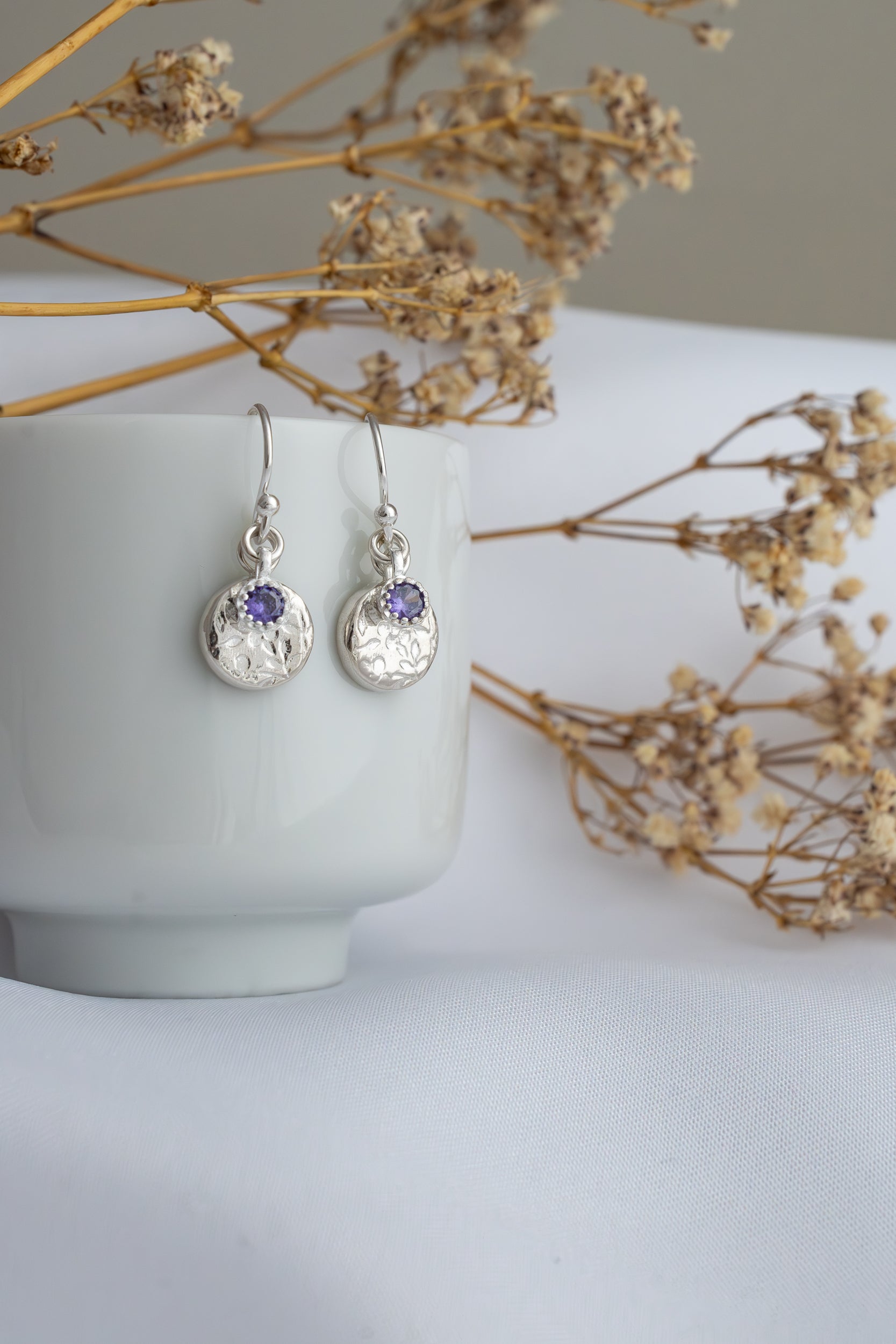 M046 Boucles d'oreilles médaillons fleuris argent pierres mauves - $82.00