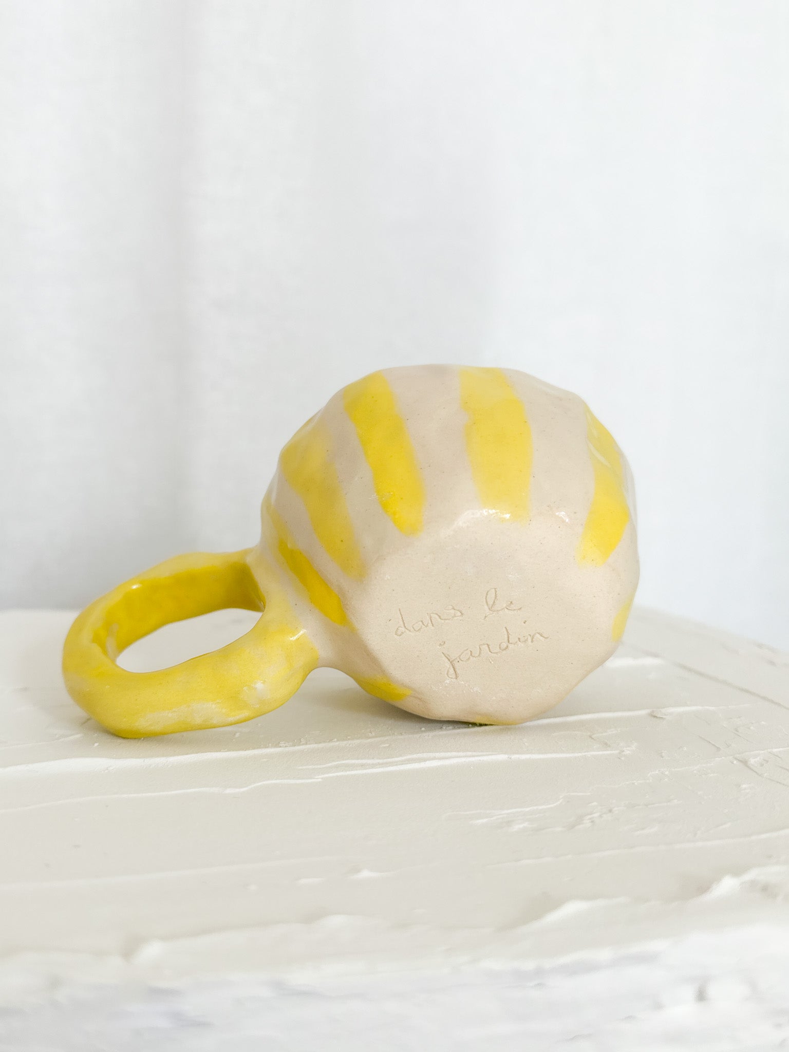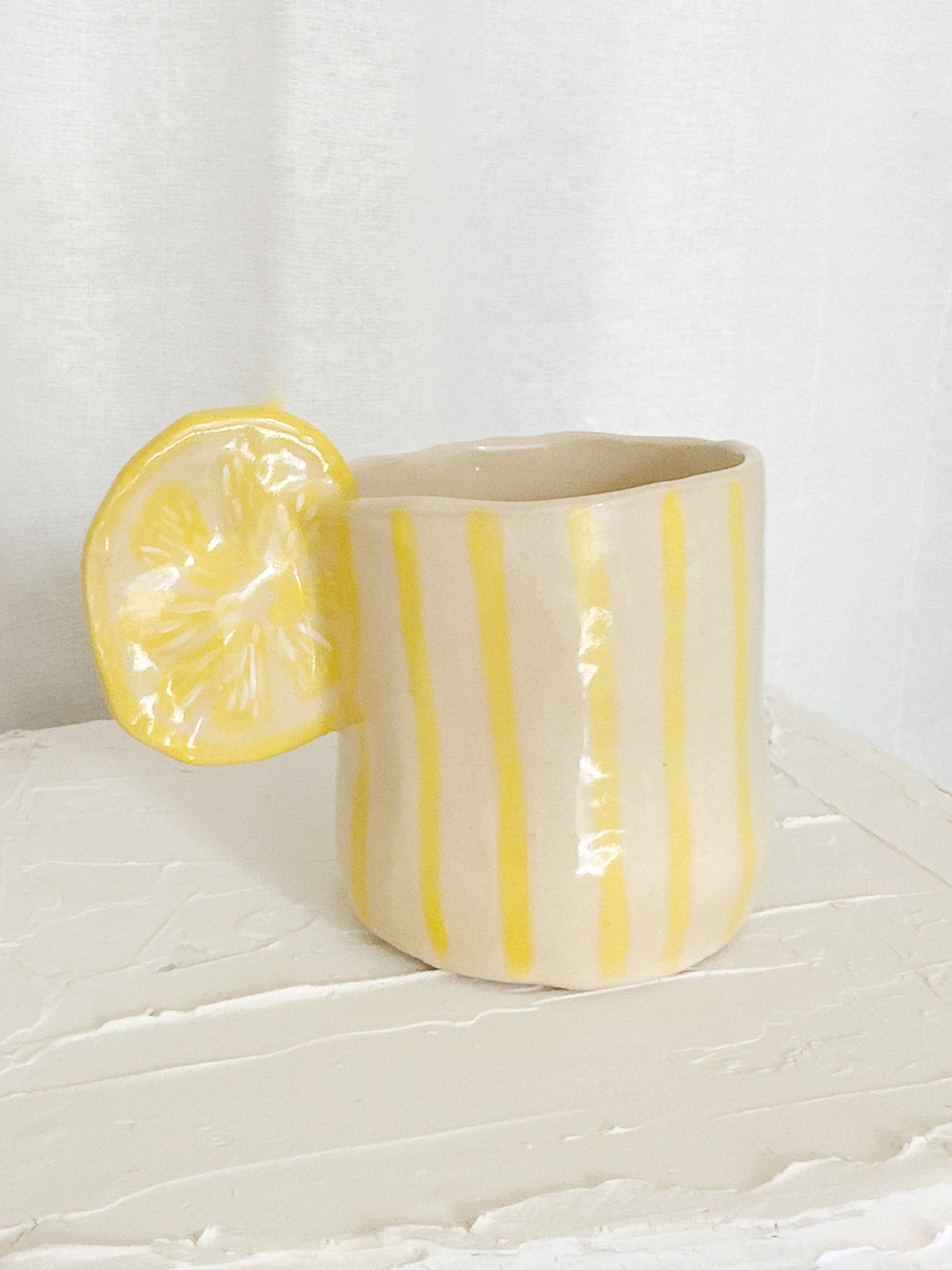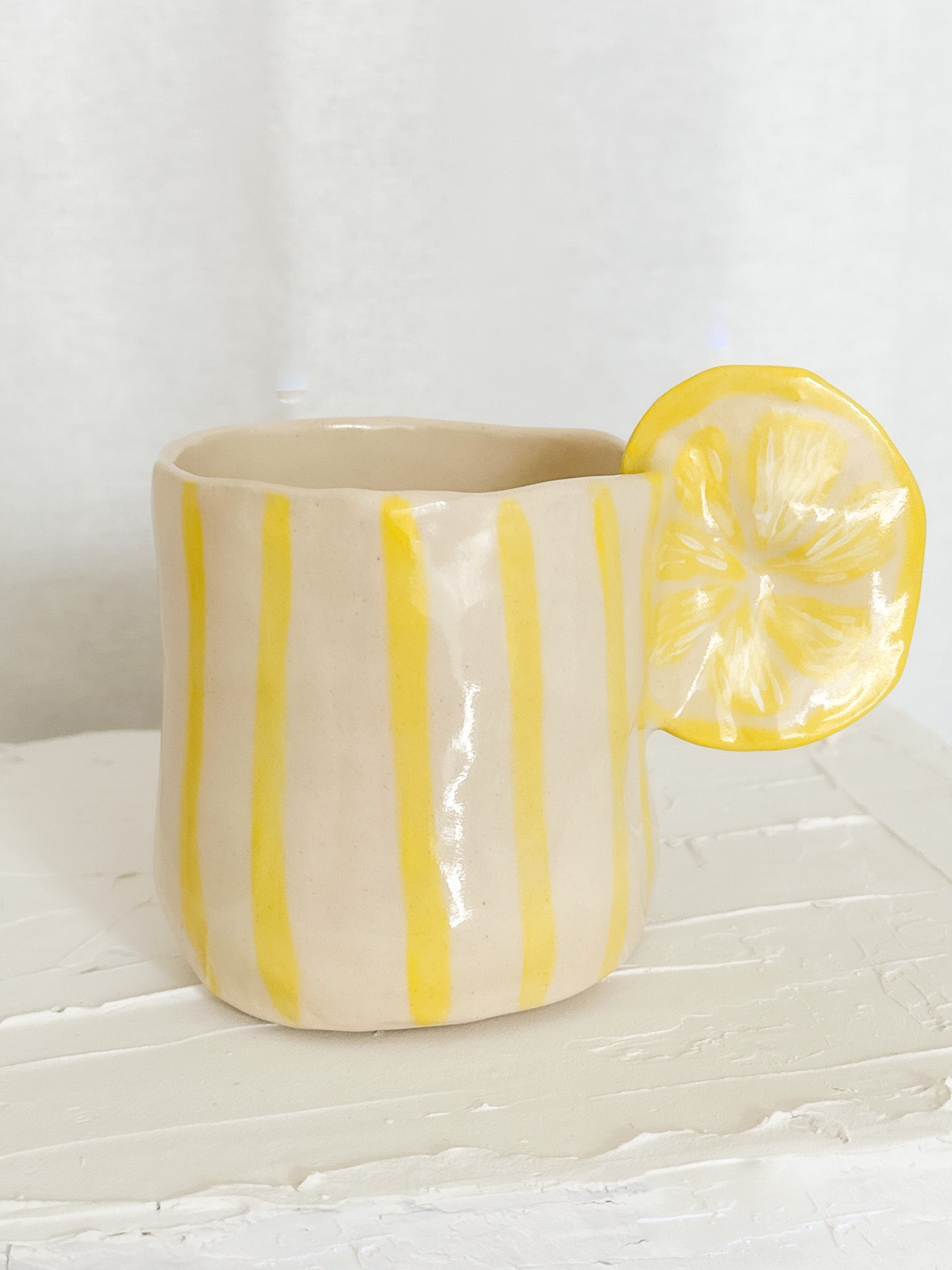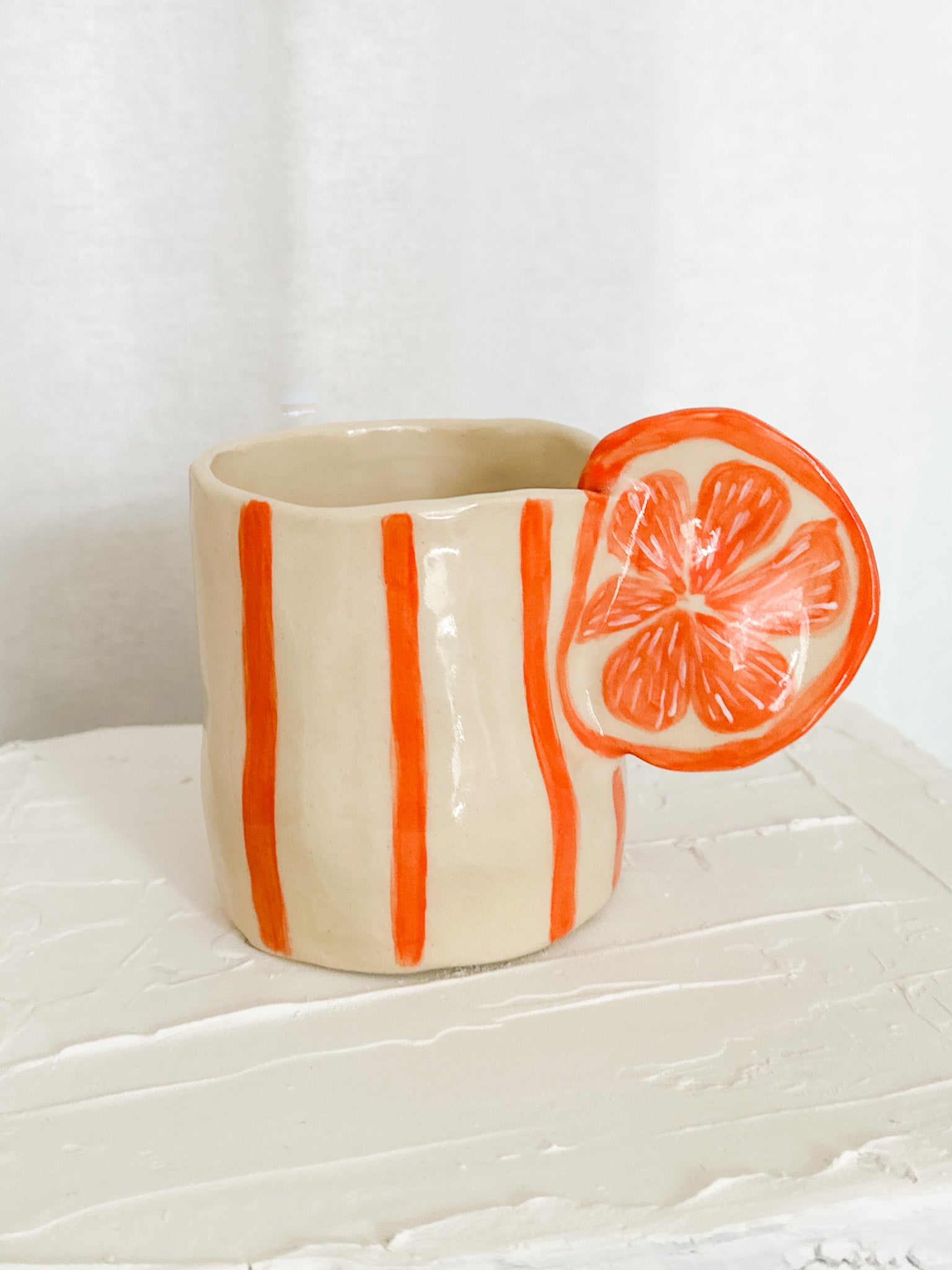 Tasses avec une anse en forme de tranche d'agrumes qui présente de petites entailles pour que vos doigts s'y insèrent facilement. Cette tasse est fabriquée en grès blanc et peut être utilisée pour les aliments et est étanche à l'eau. Lavez toujours votre pièce à la main pour vous assurer qu'elle est manipulée avec soin. Toutes nos pièces sont uniques En raison de la nature artisanale de toutes nos pièces, il est normal qu'il y ait de petites imperfections, mais nous nous assurons que tout a été testé pour être étanche (sauf mention contraire) et durable. Veuillez examiner attentivement chaque photo avant d'effectuer un achat.