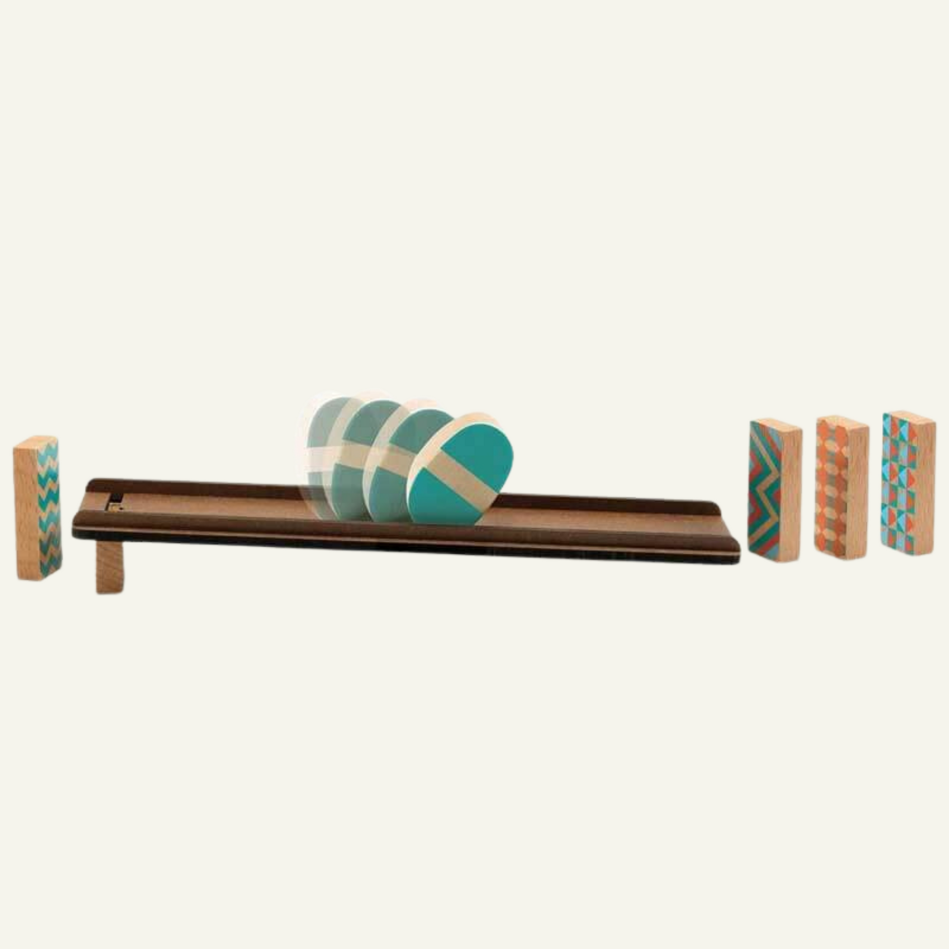 Zig & Go, un jeu de réaction en chaîne, de réflexion et de construction en bois. L'enfant suit les 3 modèles du livret pour construire son parcours ou en imagine d'autres à l'infini.