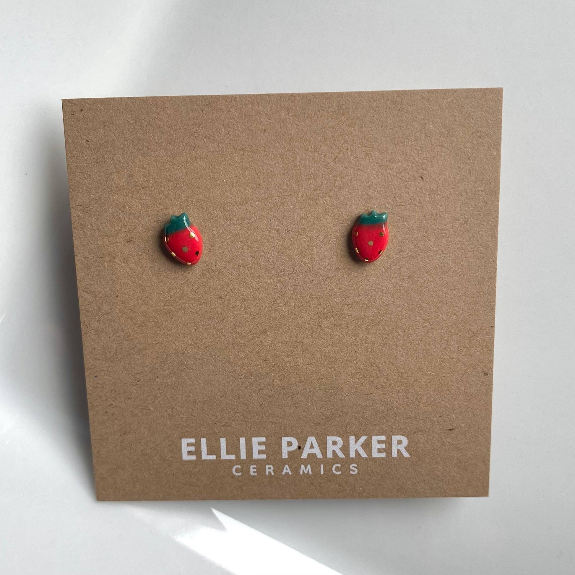These dainty ceramic strawberry stud earrings scream summer. Handshaped, glazed, and decorated with 22k gold accents, these studs are a perfect addition to any earring collection. Attached to stainless steel posts with butterfly backs. Each individual stud measures approximately 0.35” x 0.2” Earrings will be affixed to our standard square kraft earring cards. Cards measure 2.5" x 2.5" _ _ _ _ _