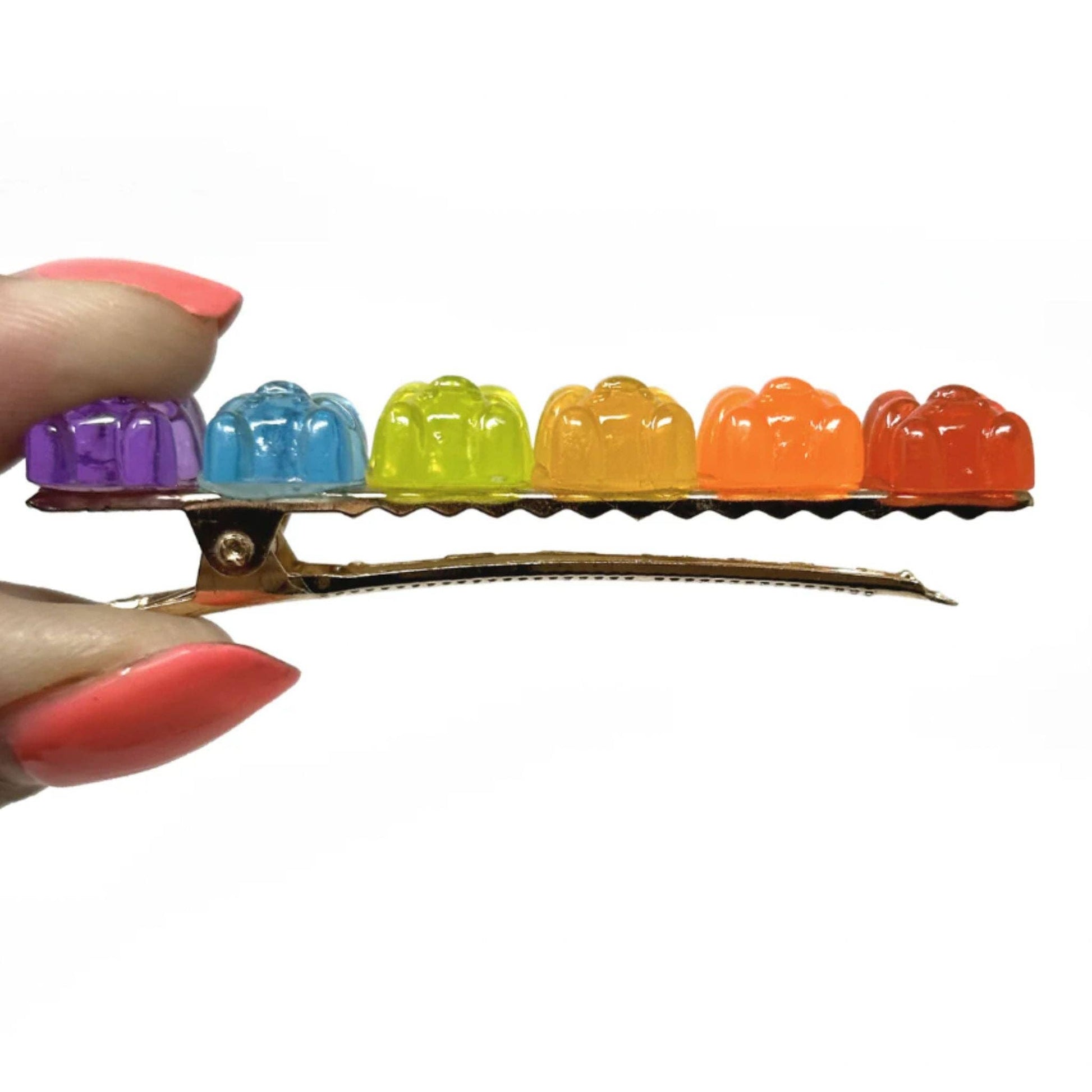 Add a playful, candy-inspired touch to your hairstyle with our Gummy Bear Barrette Set! Designed to look sweet enough to eat, these vibrant barrettes feature rows of colorful gummy bear designs that instantly brighten any outfit.