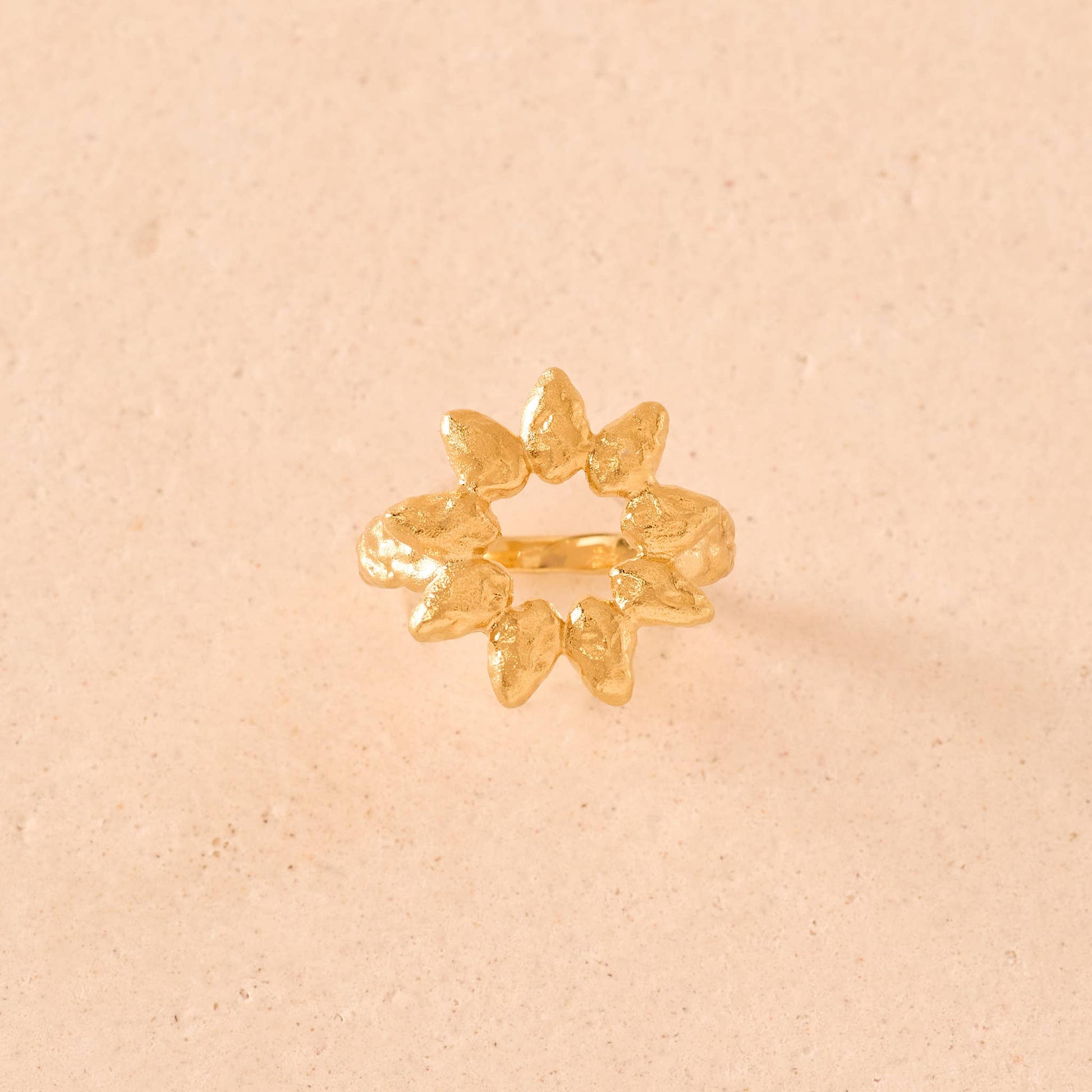 A modern take on floral design, the Hélia ring is inspired by an open sunflower, featuring large sunray-like petals, a molten surface, and a bold geometric silhouette.
