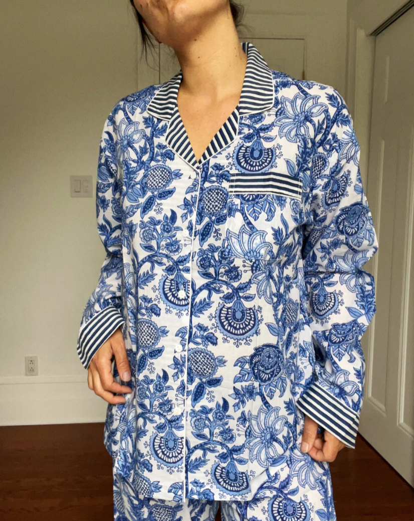 Nos pyjamas riches en couleur 100% coton sont imprimés et faits à la main à partir d’une méthode ancestrale et artisanale indienne. Chaque motif et chaque couleur sont soigneusement choisis et apprêtés manuellement, ce qui leur confère un caractère unique. Avec une coupe ample et un tissu léger, nos pyjamas se portent en toute saison.