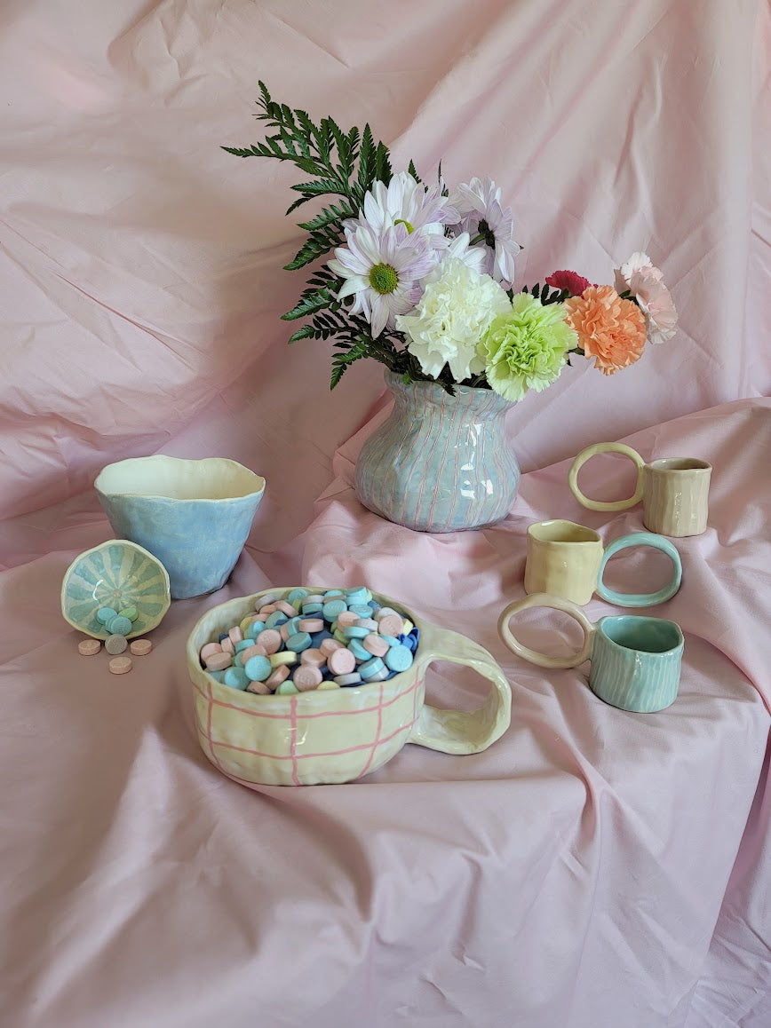 Collection of unique ceramics made in Montreal by Salvage ans Stone for the Palais Bulles. Dignies of Alice in Wonderwork!