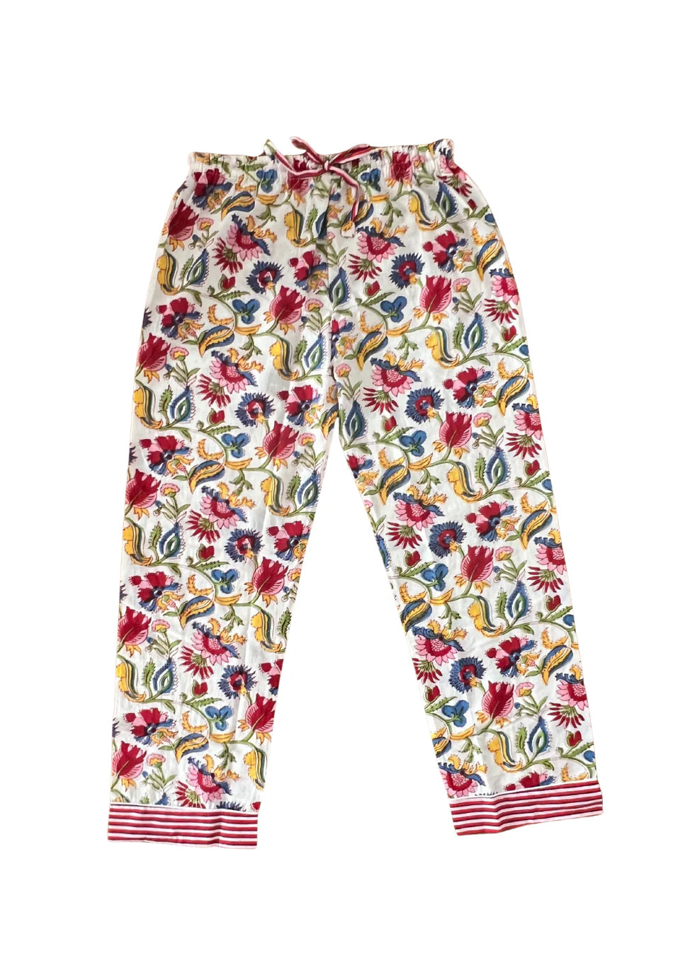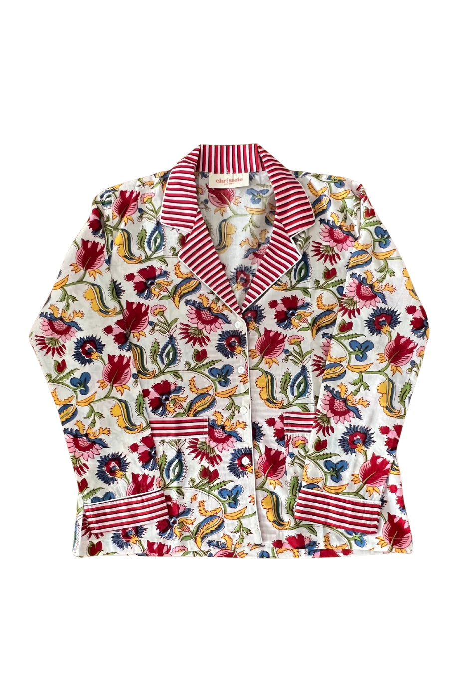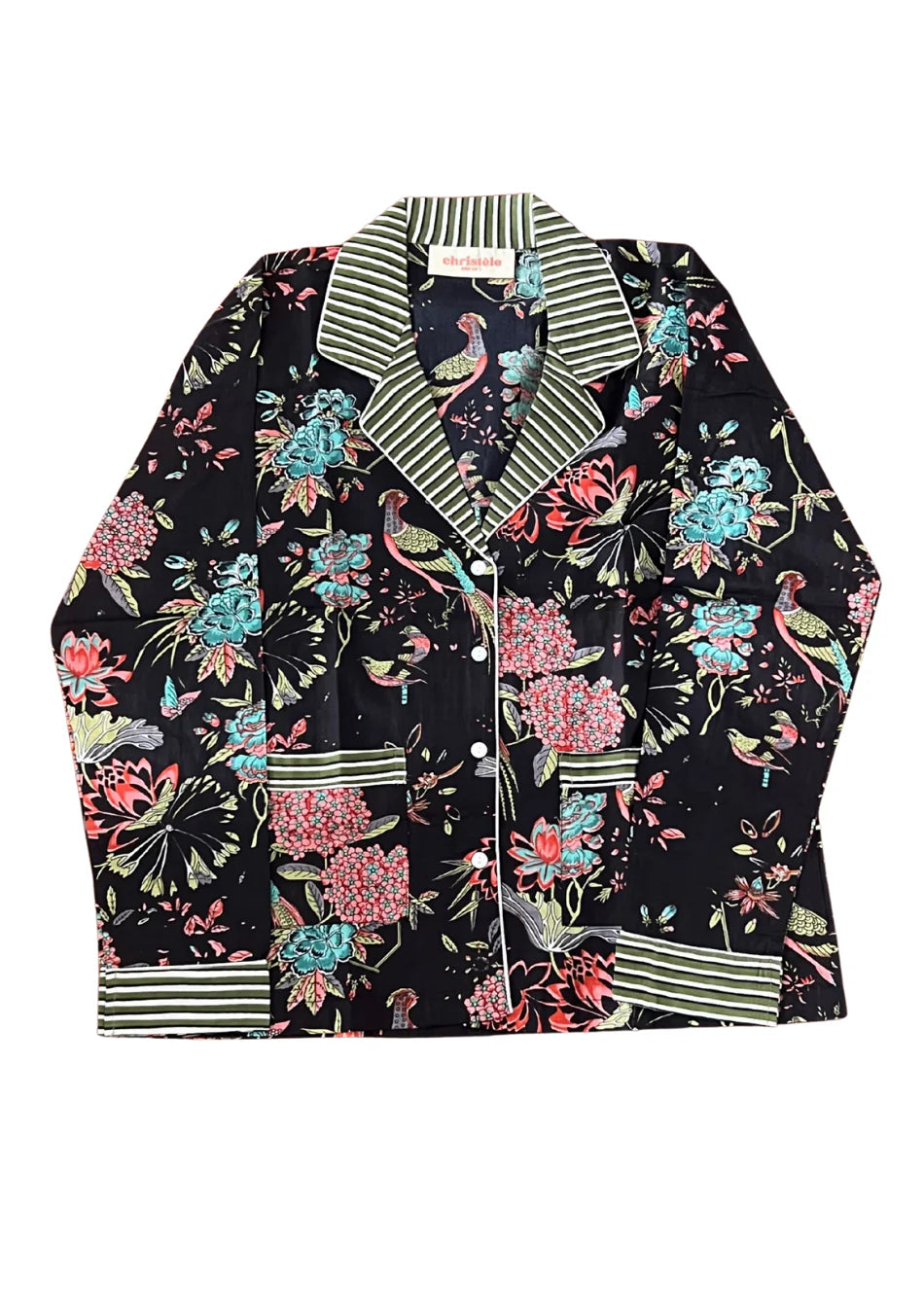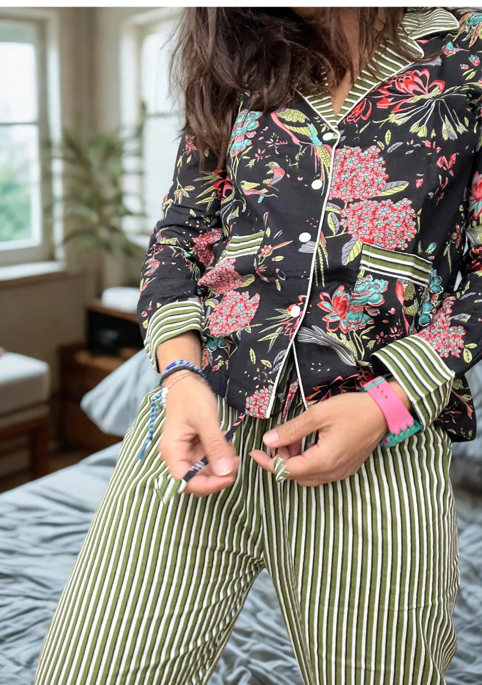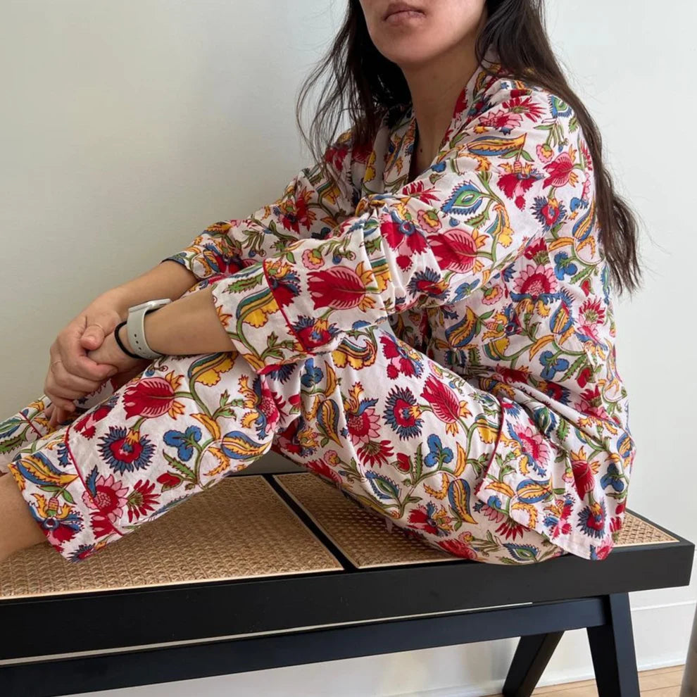 Nos pyjamas riches en couleur 100% coton sont imprimés et faits à la main à partir d’une méthode ancestrale et artisanale indienne. Chaque motif et chaque couleur sont soigneusement choisis et apprêtés manuellement, ce qui leur confère un caractère unique. Avec une coupe plus cintrée et un tissu léger, nos pyjamas se portent en toute saison. La chemise peut parfaitement se porter de jour, agencée à un jean ou un pantalon plus habillé.