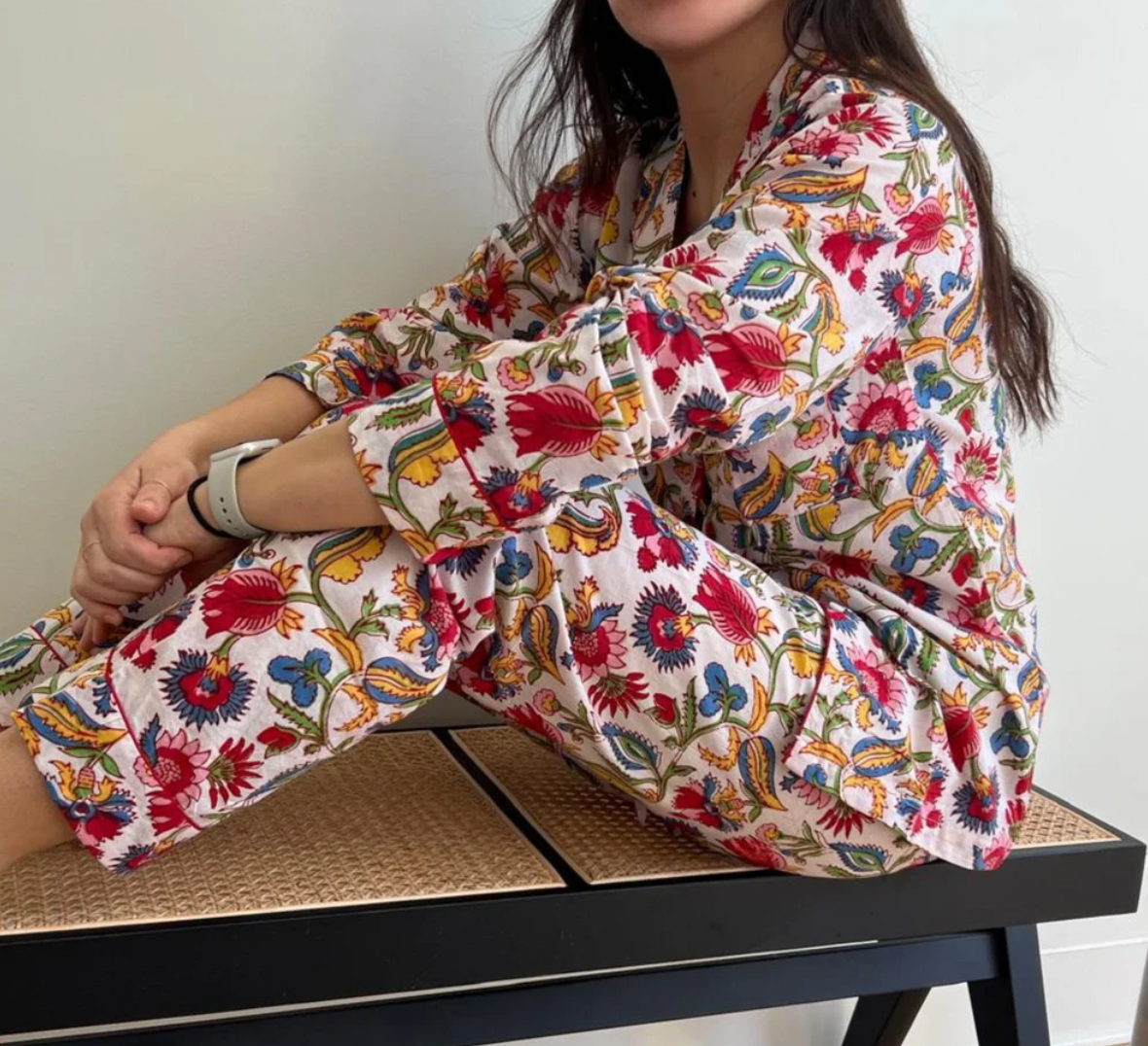 Nos pyjamas riches en couleur 100% coton sont imprimés et faits à la main à partir d’une méthode ancestrale et artisanale indienne. Chaque motif et chaque couleur sont soigneusement choisis et apprêtés manuellement, ce qui leur confère un caractère unique. Avec une coupe ample et un tissu léger, nos pyjamas se portent en toute saison.