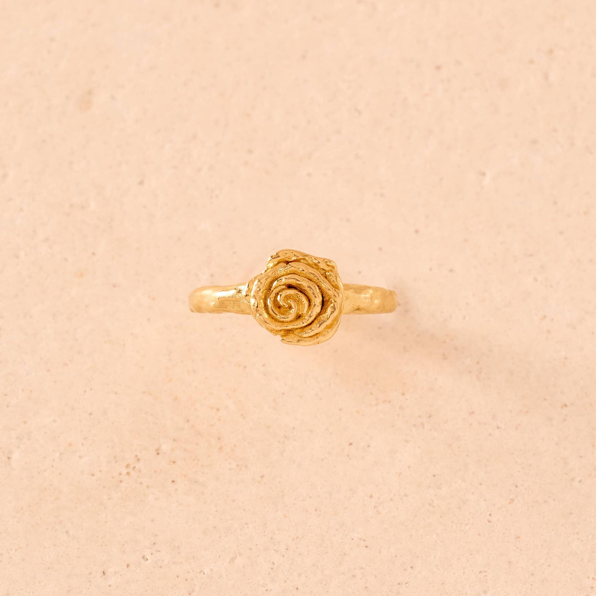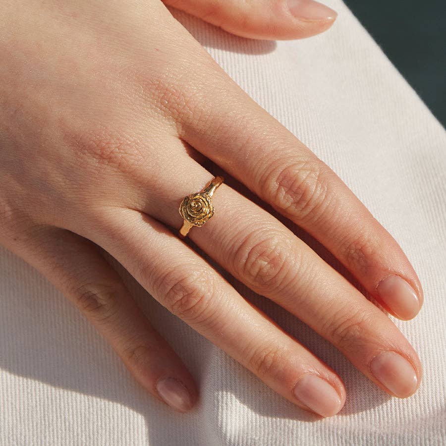 A miniature rose flower with textured petals, sculpted into a timeless floral ring.