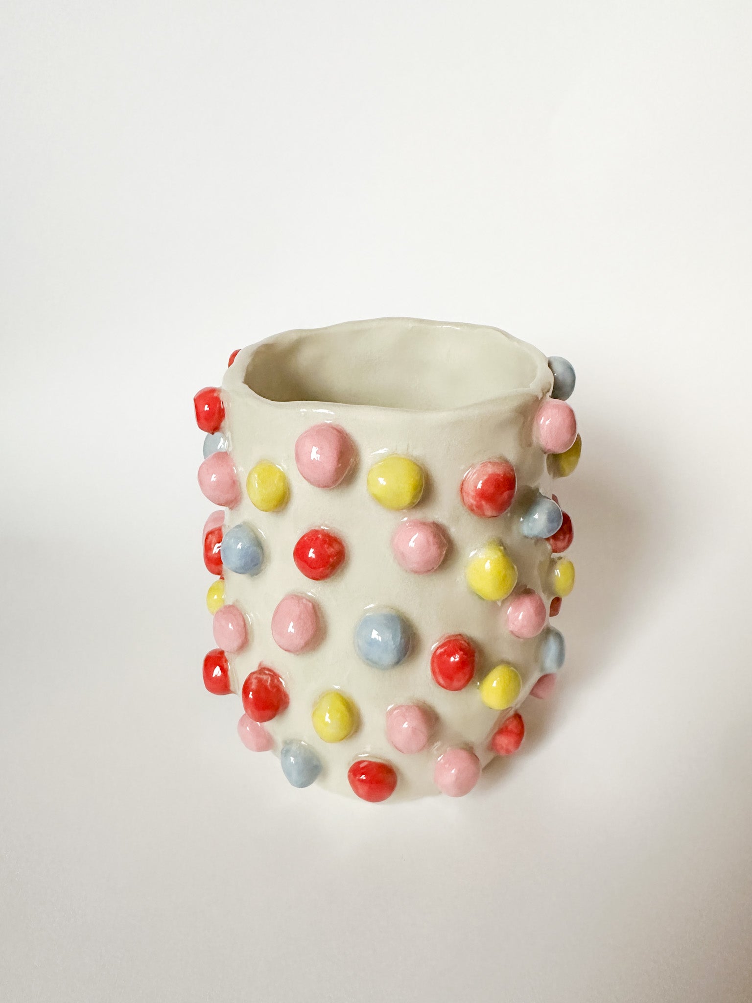 Colorful dots on white stoneware. Food safe & water tight. All the pieces are one of a kind!