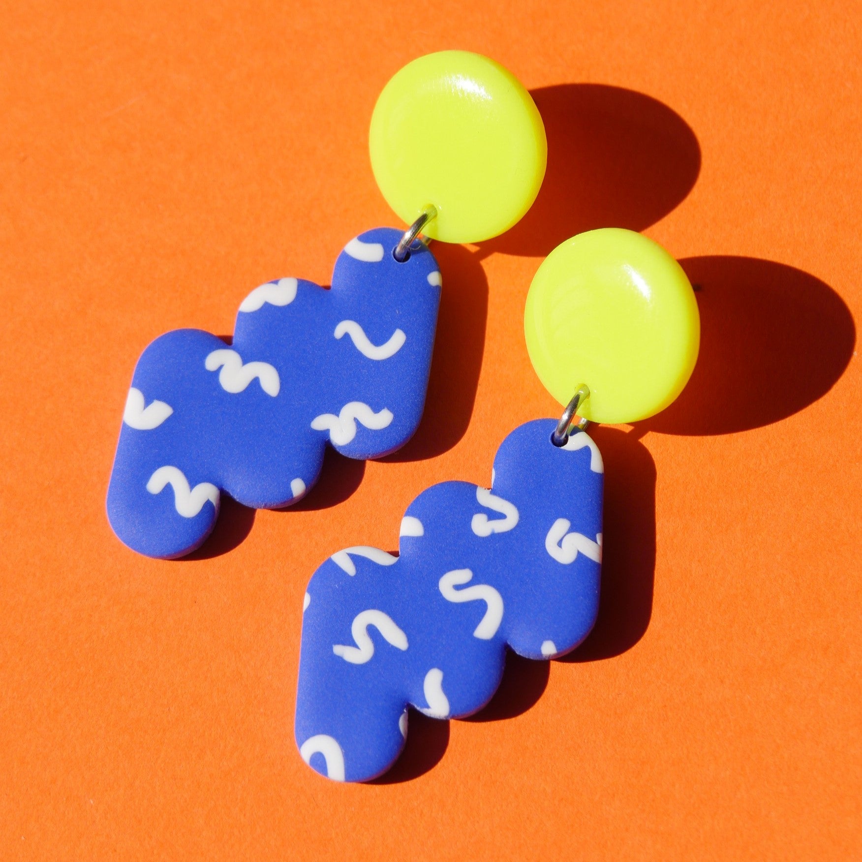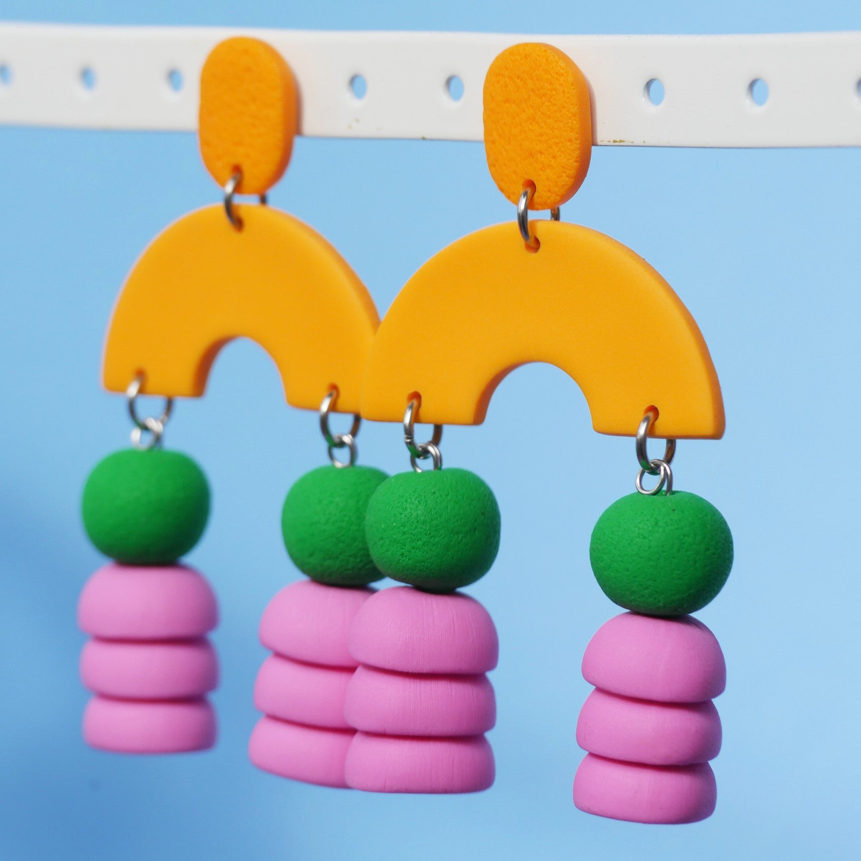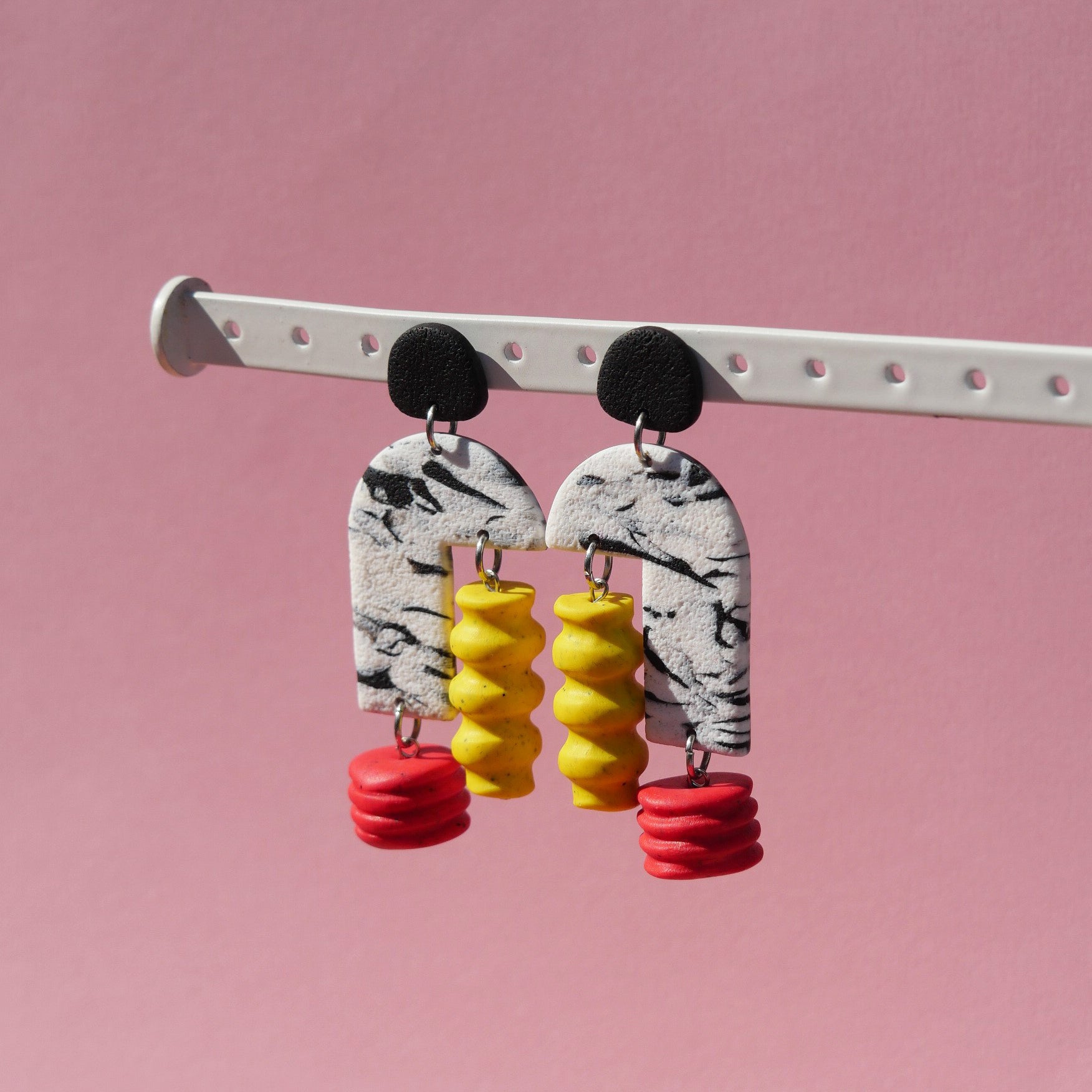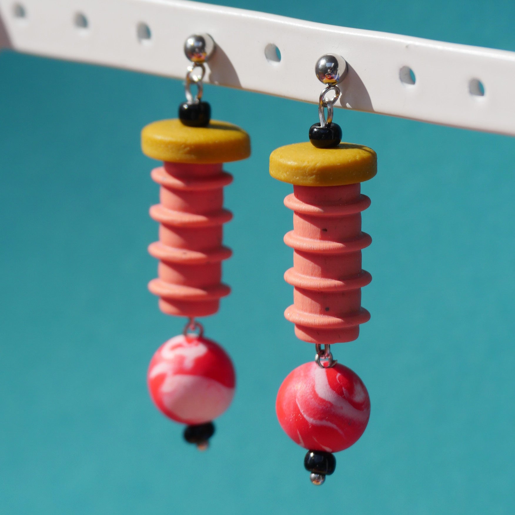 Faites à la main à Montréal, ses boucles sont en argile polymère et les tiges en acier inoxydable hypoallergene.