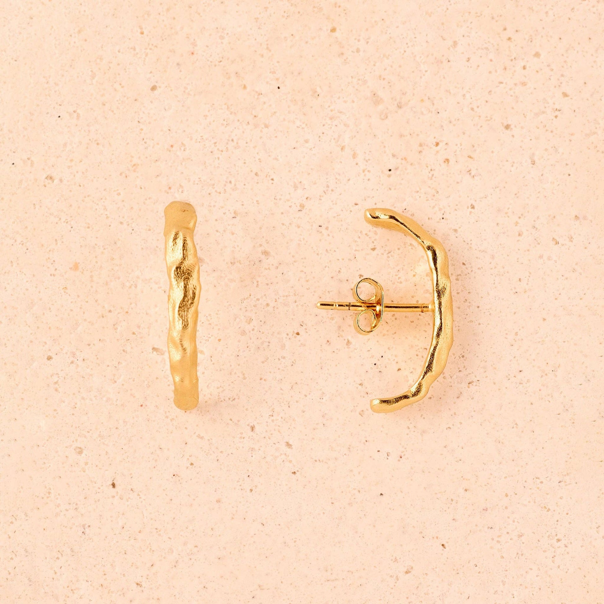 Boucles d'oreilles demi-boucles de forme irrégulière et légèrement incurvée, avec une finition texturée. Leur forme allongée et verticale crée l'effet d'une manchette d'oreille.
