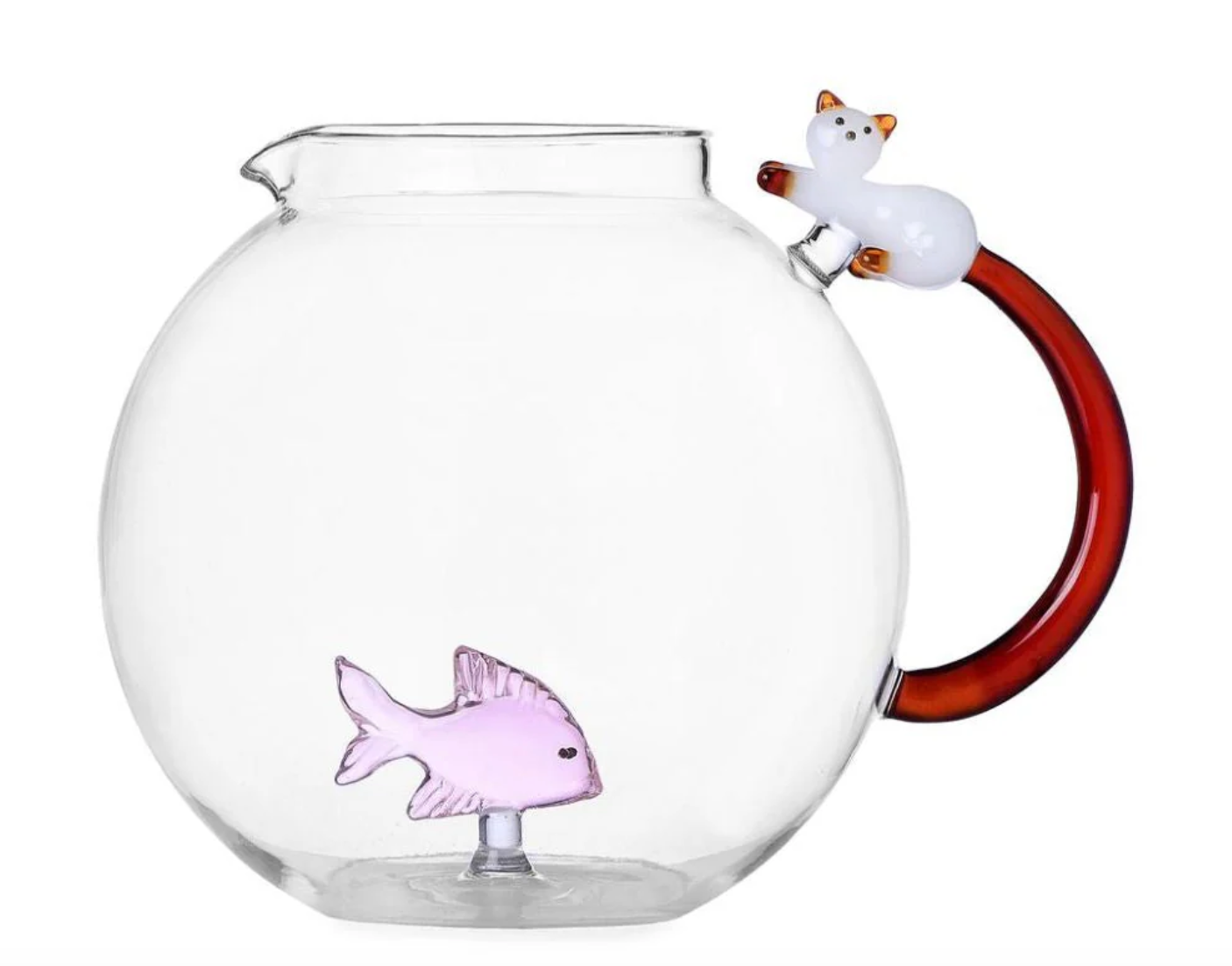 Adorable petit pichet en verre borosilicate soufflé a la main represéntant un chat espiègle et un petit poisson.