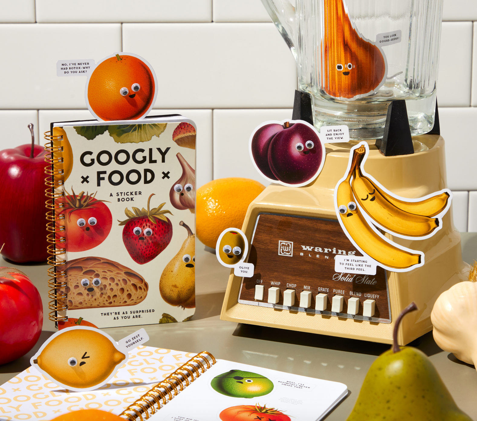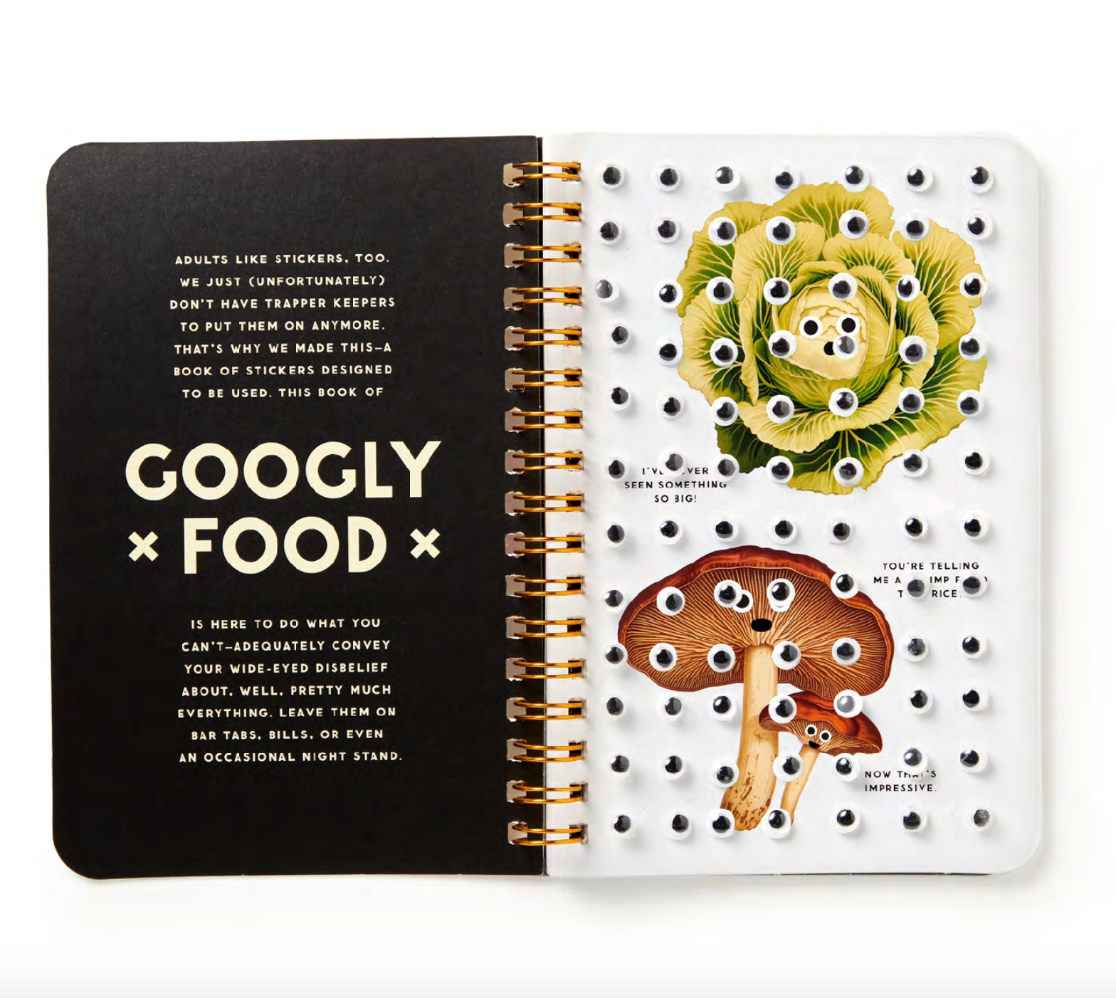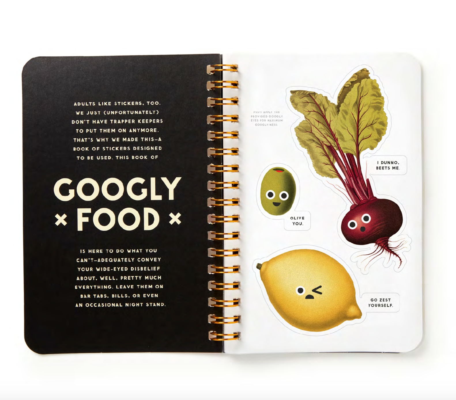 STICKER BOOK - Adults like stickers, too. We just (unfortunately) don't have trapper keepers to put them on anymore. That's why Brass Monkey made this-a book of stickers designed to be used. This book of Googly Fruit is here to say what fruit can' t- make clever comments and judge all the people, places, and inanimate objects around you. They're perfect for bar tabs, tax bills, and, well, life.