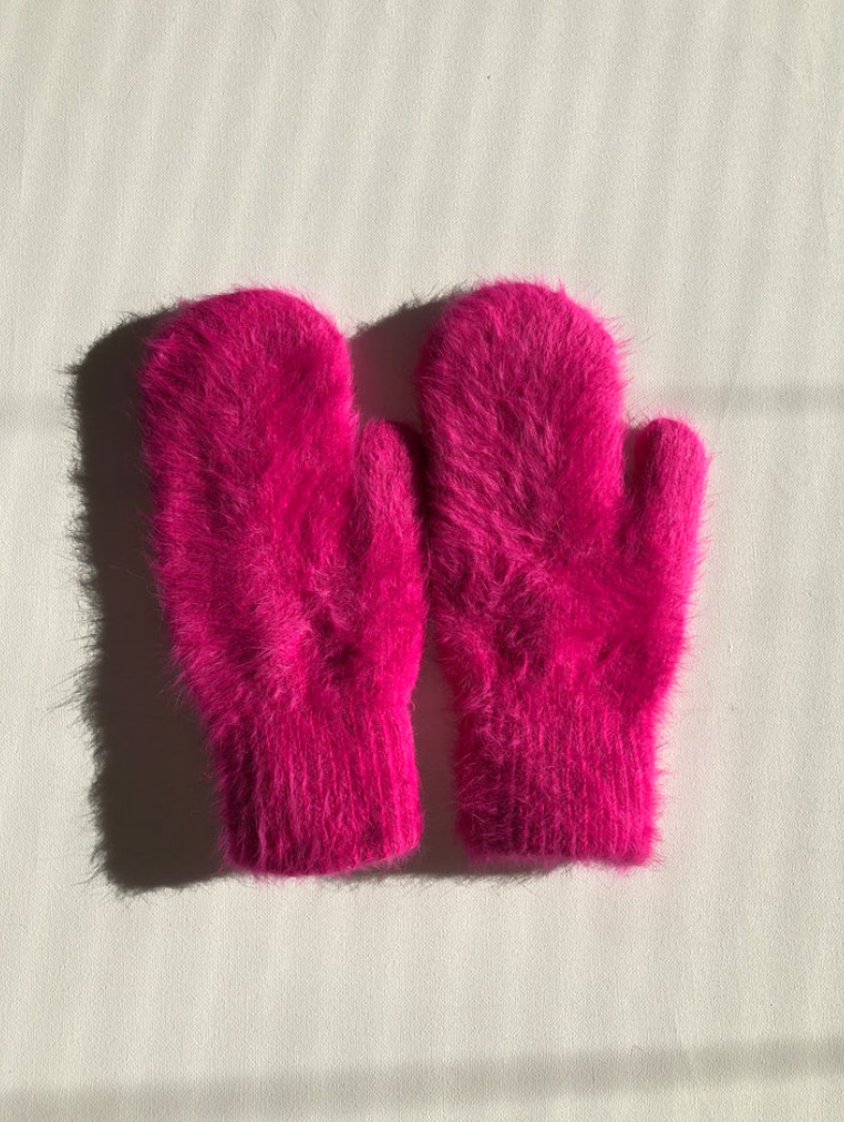Our super cute mittens are made from a fluffy angora yarn, and constructed using a double knit to make the mittens super warm and compact.