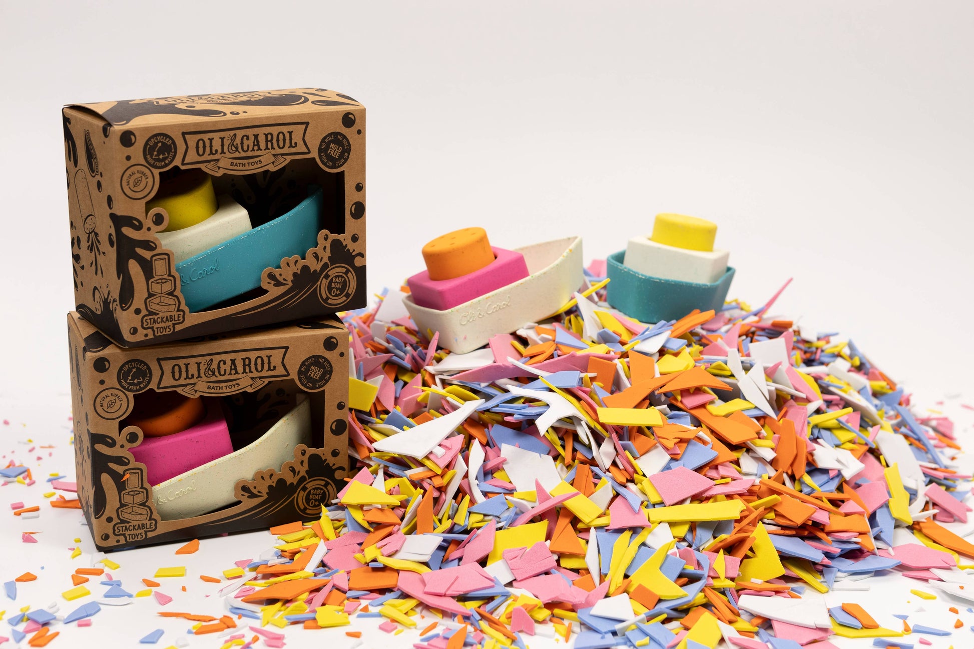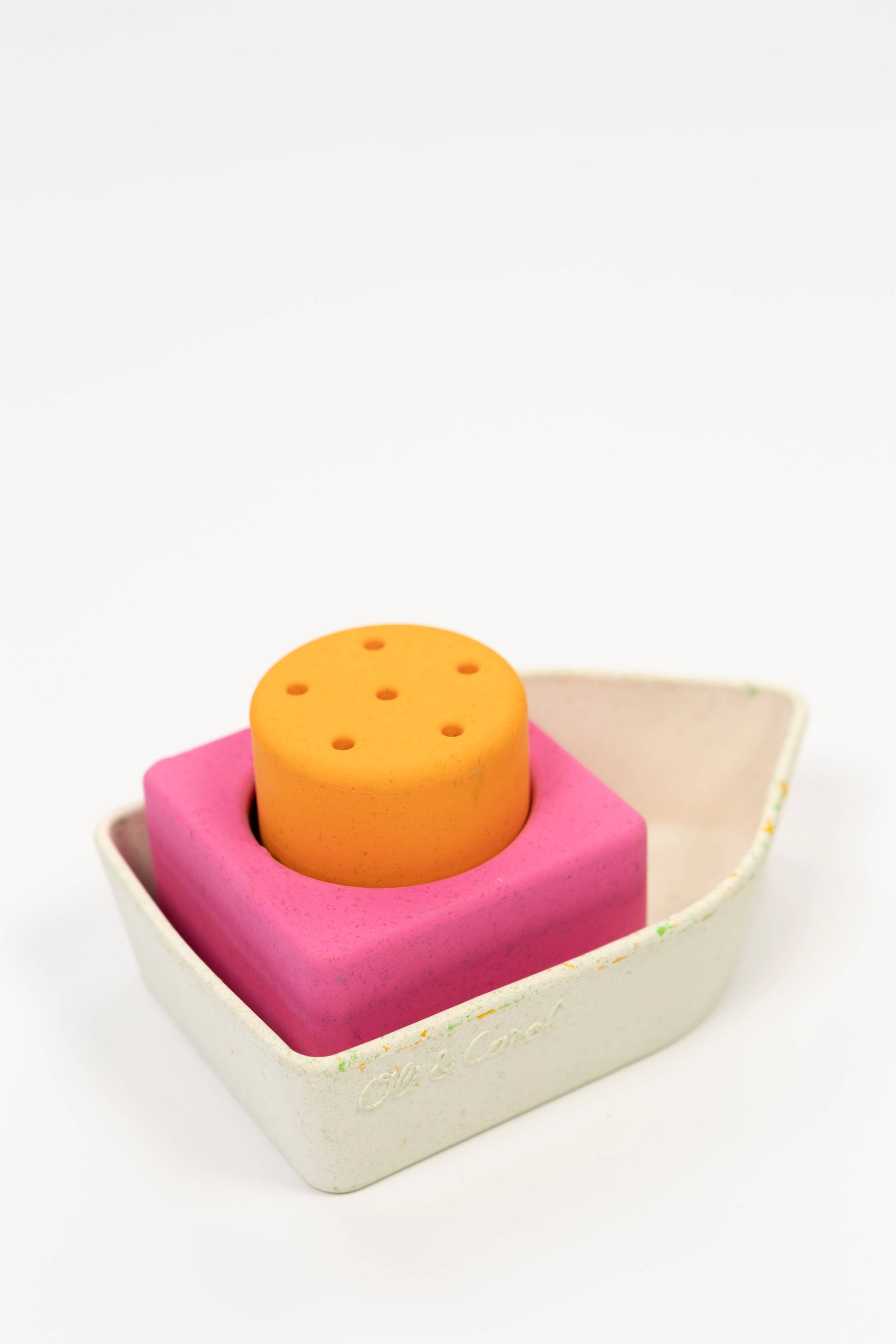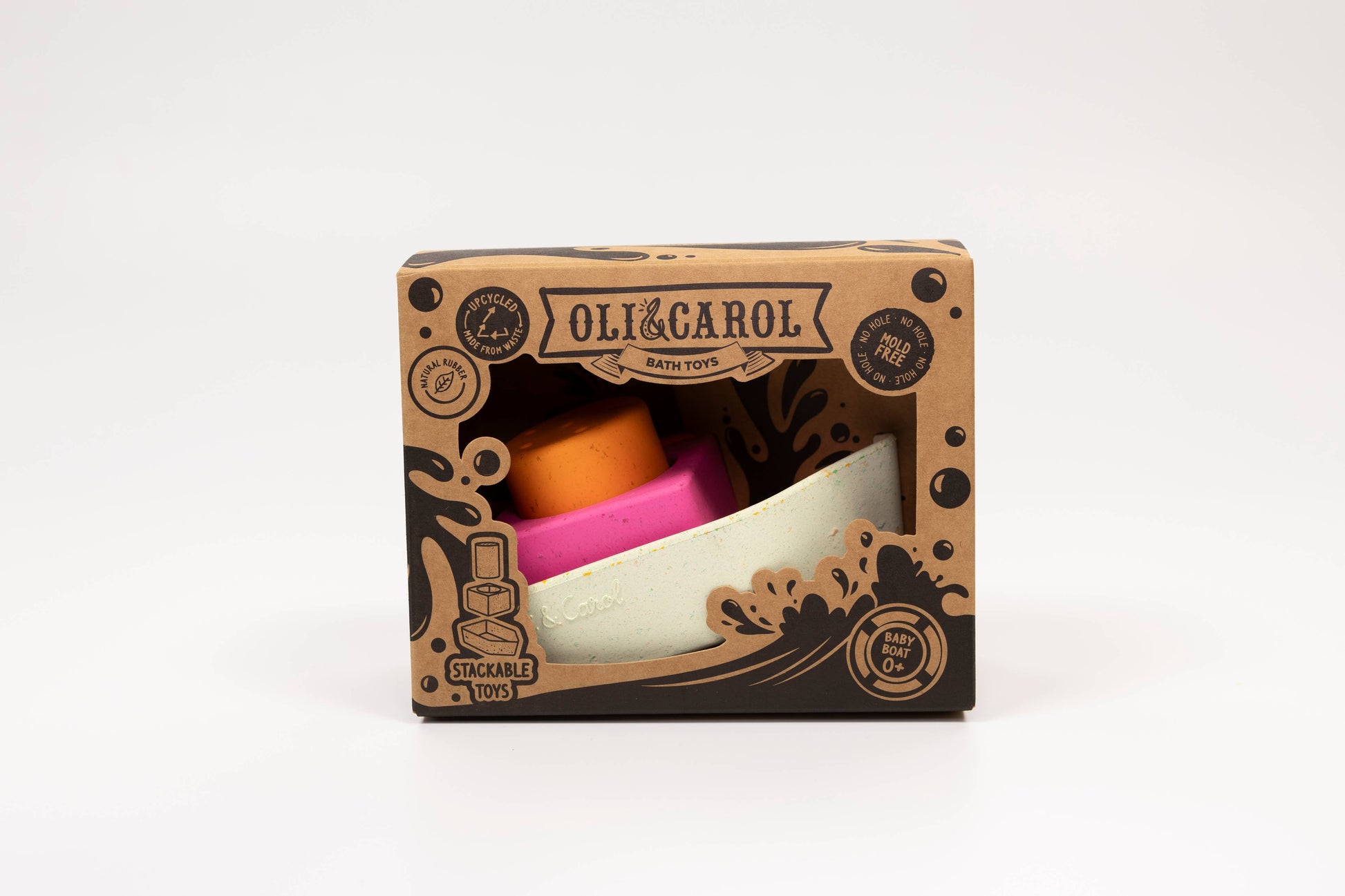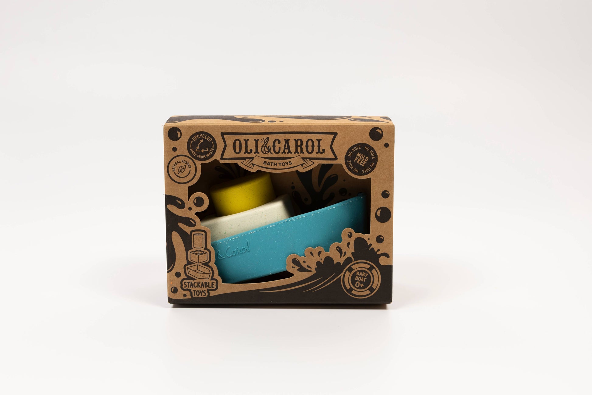The Oli&Carol Upcycled Boat is a natural rubber educational toy meant for bath time interactive play! Made from our own waste giving a second life to leftovers. It promotes imaginative play and develops fine and gross motor skills by encouraging physical activities that require filling, stacking draining water from each piece. Upcycled Boat helps kids' hand-eye coordination while improving problem-solving abilities cognitive development due to water play interaction. Reusing leftovers and made from upcycled materials, these bath toys show our commitment to keeping the planet green. Each bath toy boat is carefully crafted to be durable and safe for endless play. When you choose Upcycled Boats, you’re helping reduce waste and making our world a cleaner place. Plus, these boat toys for bath teach kids to love and care for the environment from a young age.