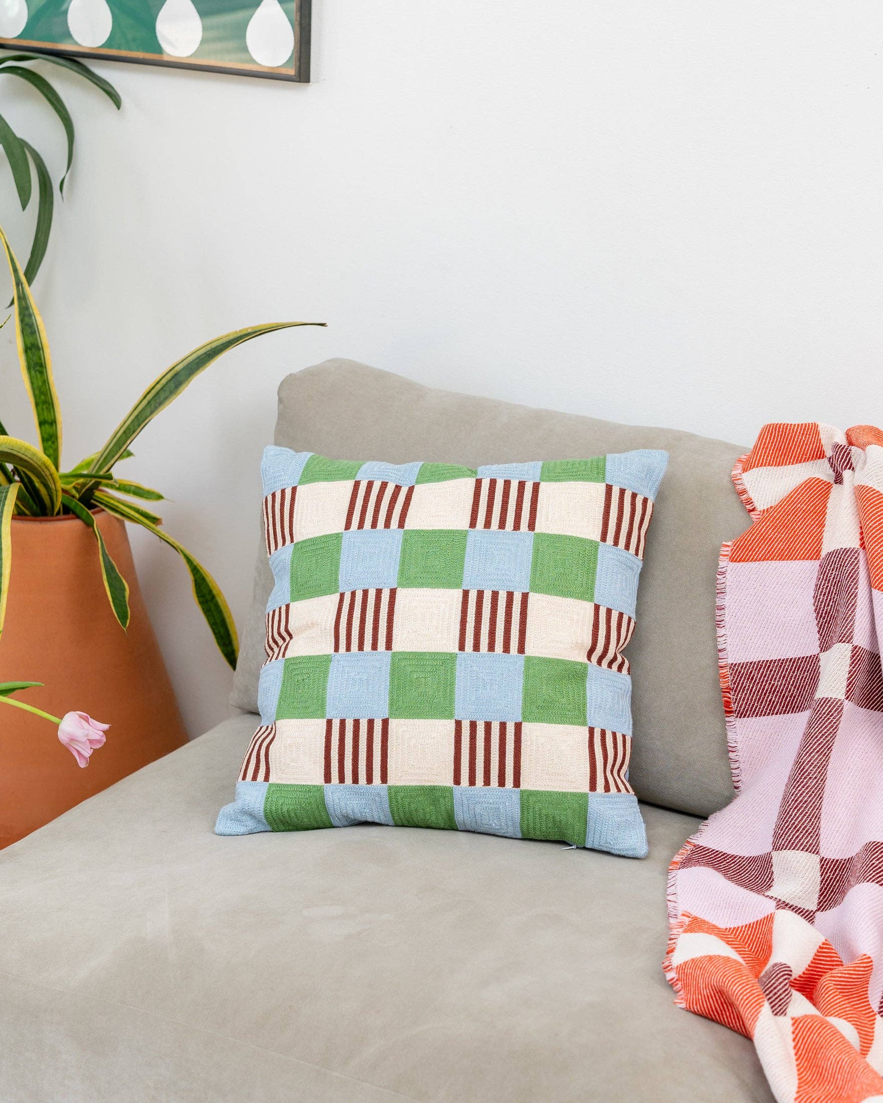 This cushion takes a classic pattern and gives it a playful striped twist. It's fully embroidered by hand, creating a unique, textured finish. Plus, it features our all-time favorite color combo—if you hadn’t guessed already.