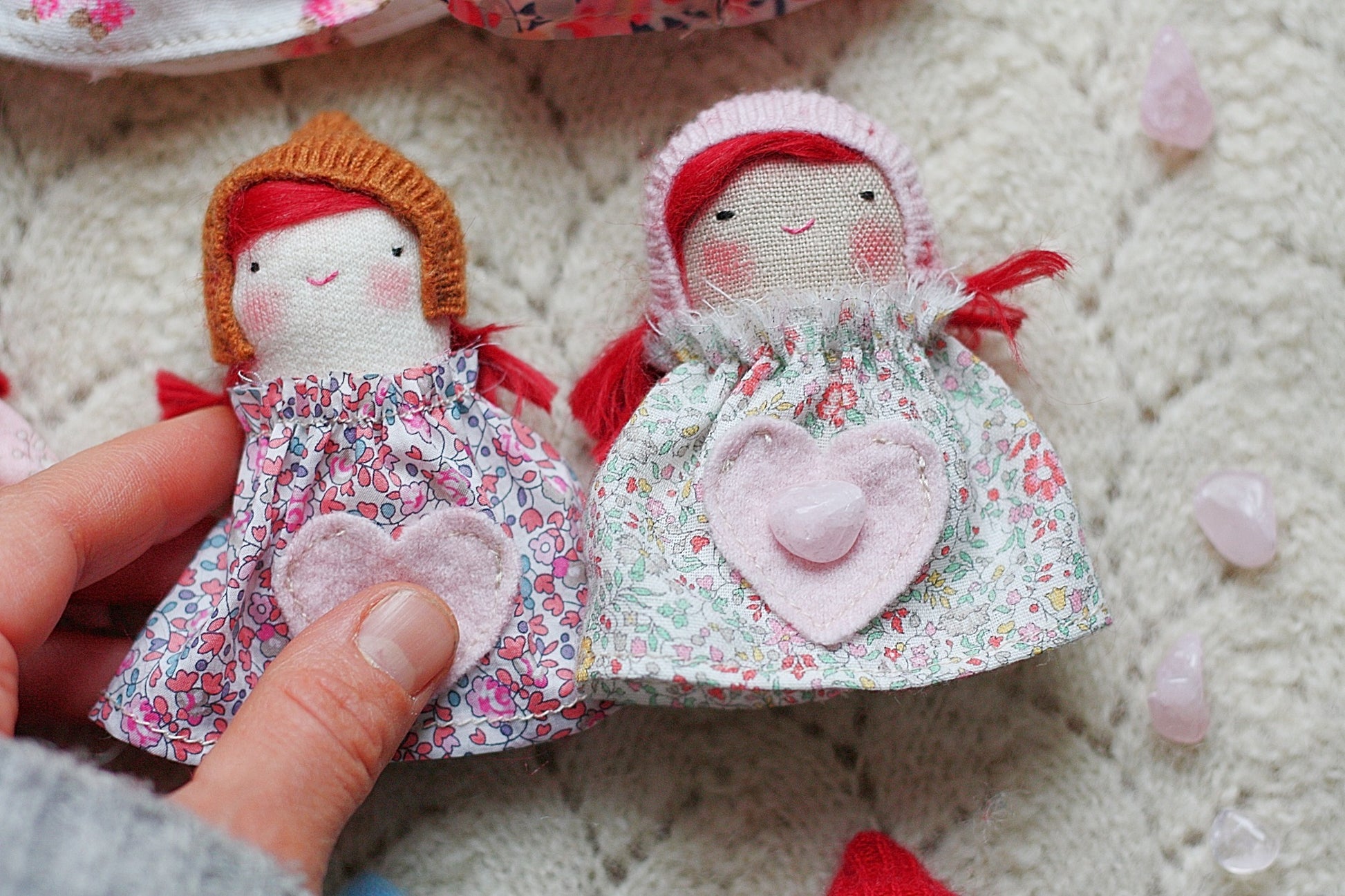 Dans leurs petites poches en coeur, elles offrent un porte bonheur. L'améthyste, pour la paix, la sérénité et la créativité. Le quartz rose pour la douceur, l'amour et la confiance en soi.