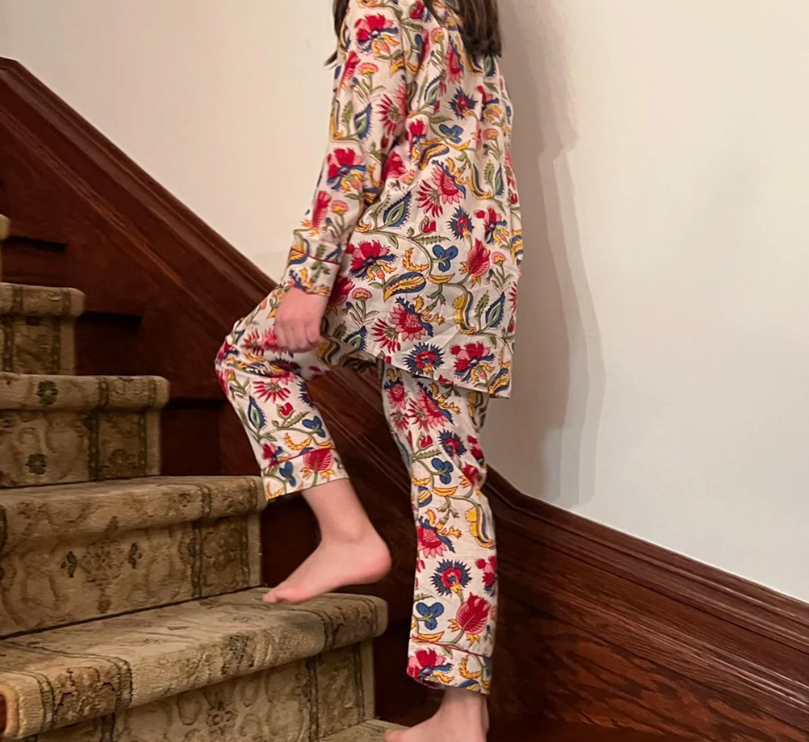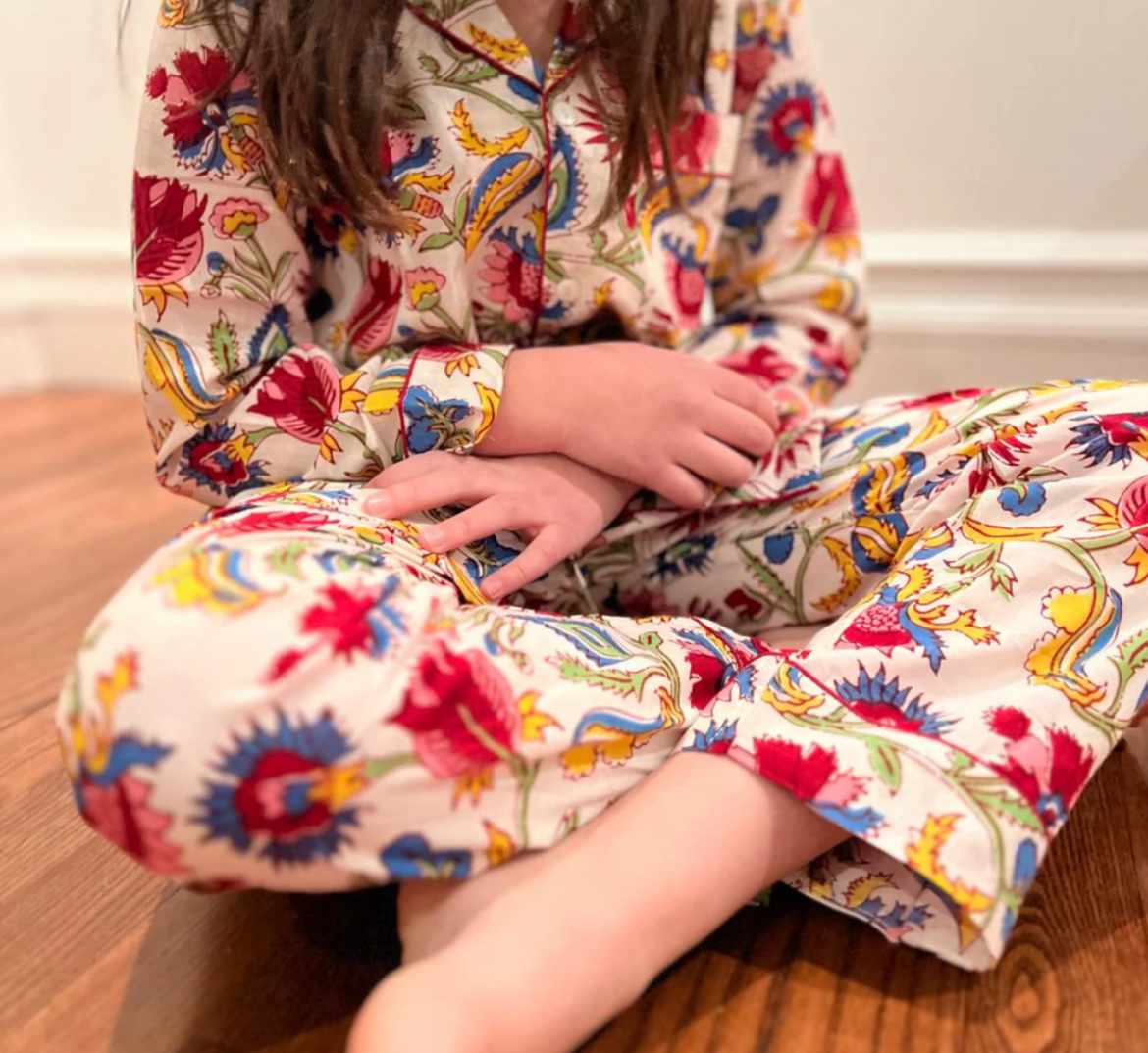 Nos pyjamas riches en couleur 100% coton sont imprimés et faits à la main à partir d’une méthode ancestrale et artisanale indienne. Chaque motif et chaque couleur sont soigneusement choisis et apprêtés manuellement, ce qui leur confère un caractère unique. Avec une coupe légèrement ample et un tissu léger, nos pyjamas se portent en toute saison.